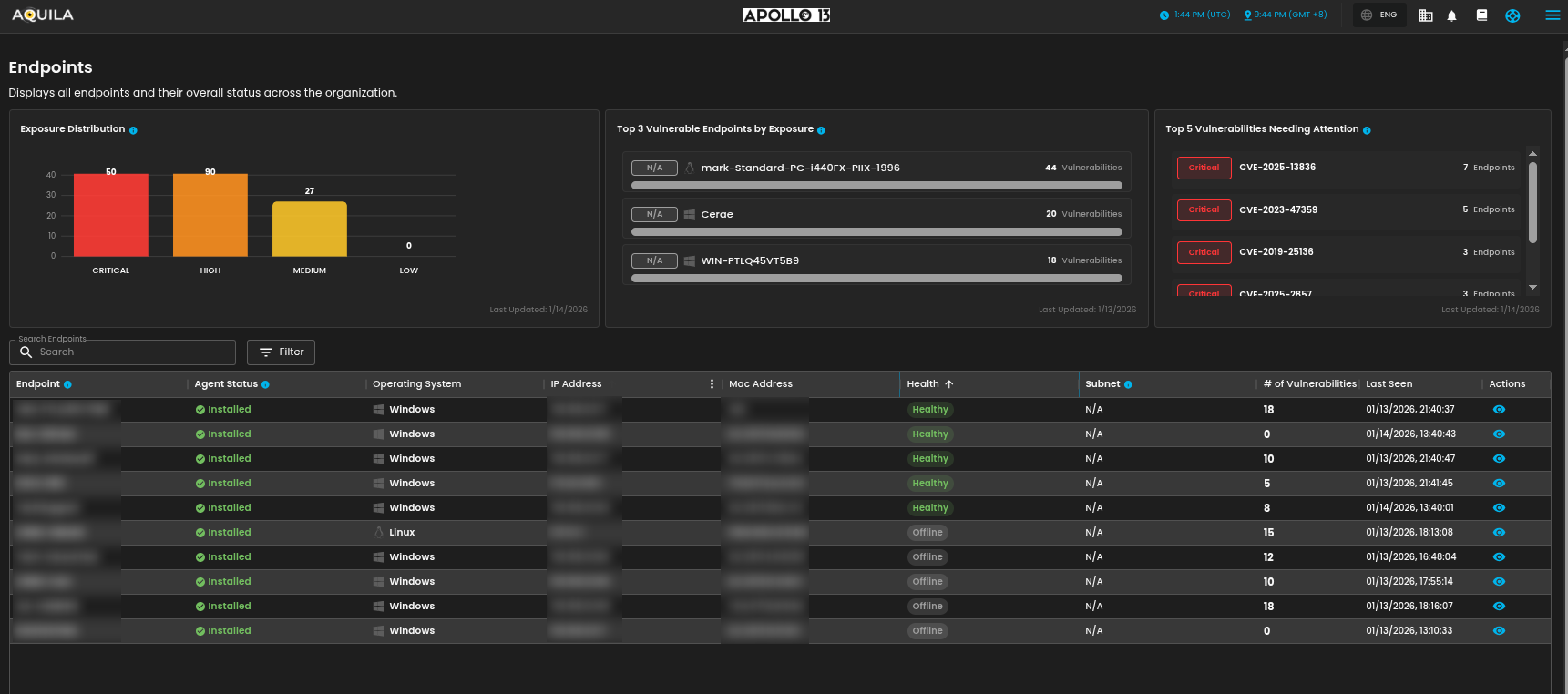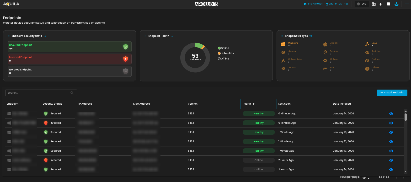 Confirm endpoint appears in AQUILA backend / SOC dashboard