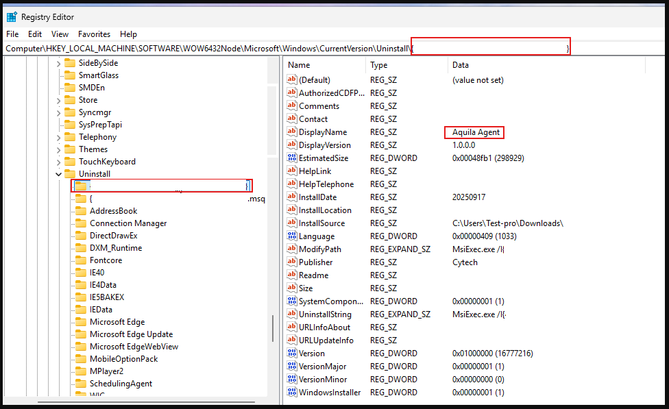 Computer\HKEY_LOCAL_MACHINE\SOFTWARE\WOW6432Node\Microsoft\Windows\CurrentVersion\Uninstall\"{Aquila Product Code}" -