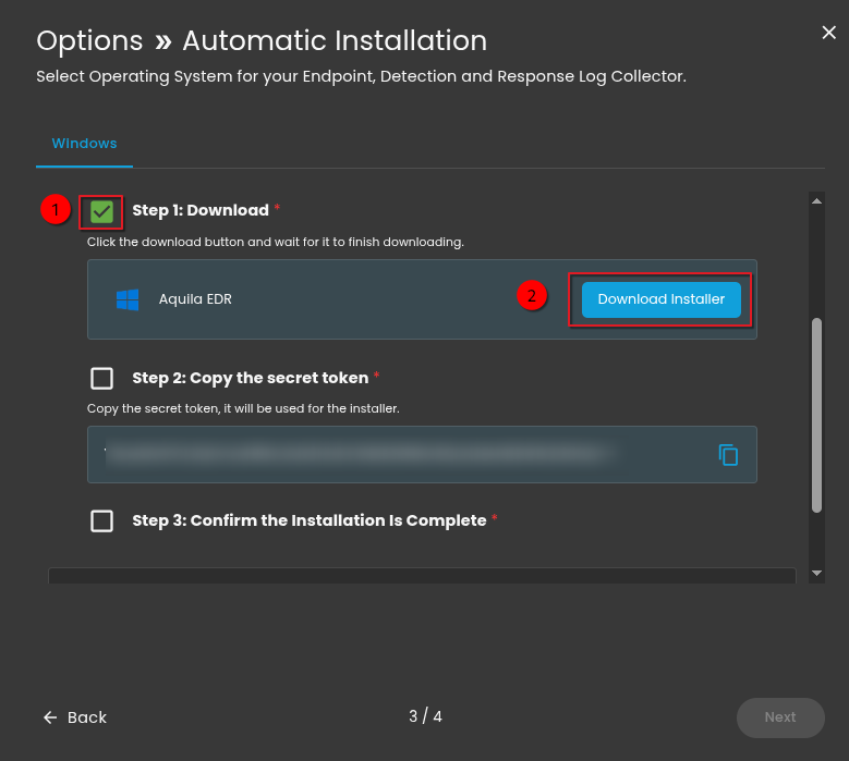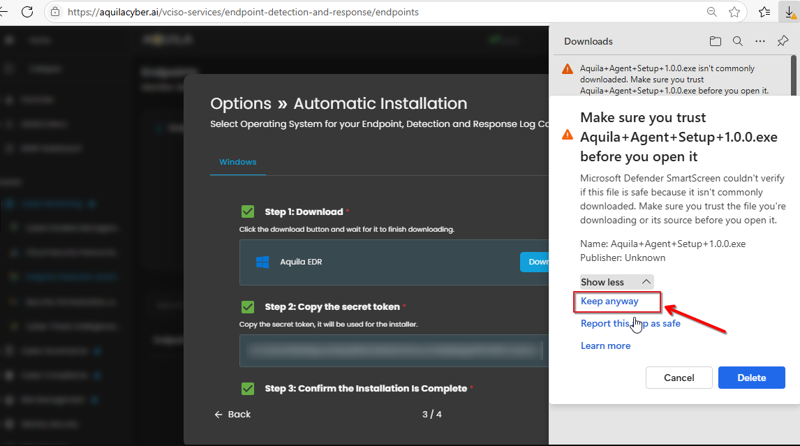 6. Follow the number of steps to keep the AQUILA EDR installer.