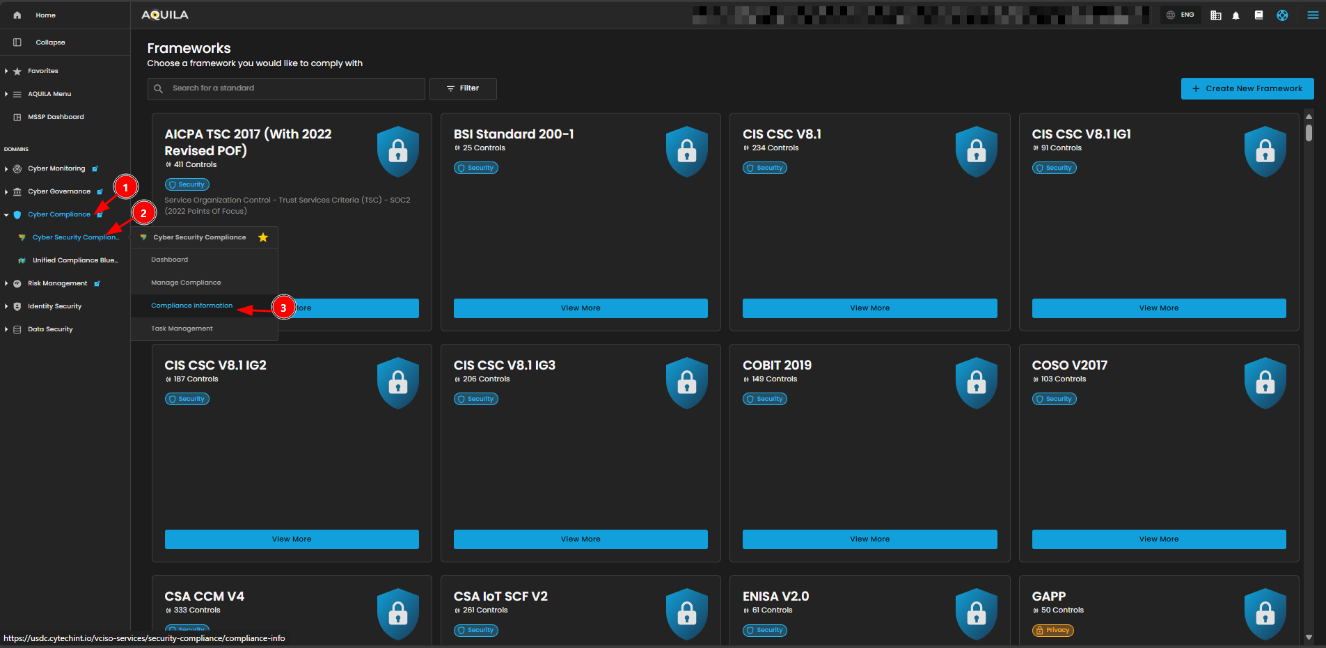 1. Search Bar - The search bar allows you to look up and filter different compliance standards or frameworks.