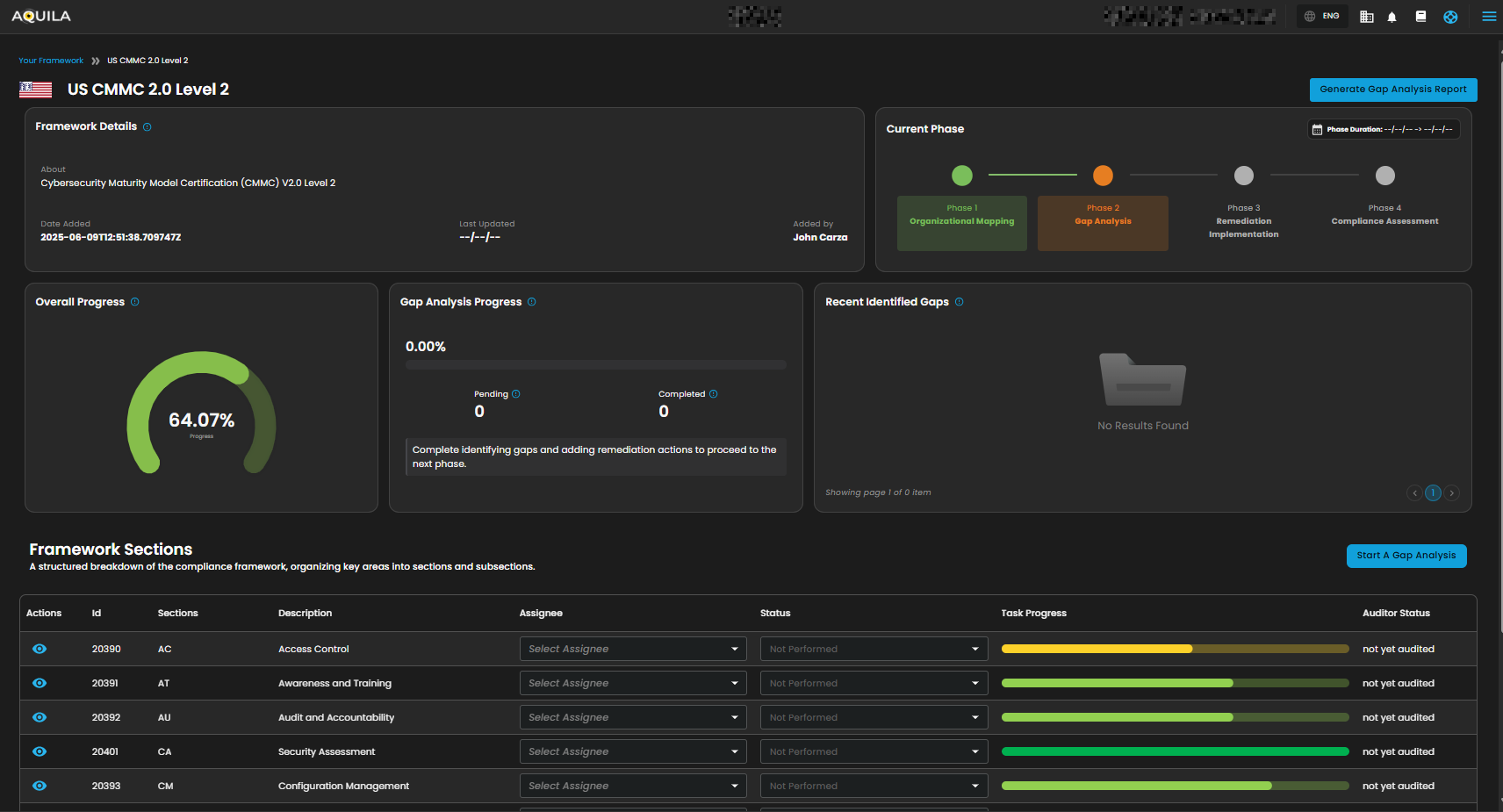 If you click also the “View Framework” you’re taken to a detailed compliance framework dashboard for the ISOs. This page gives you a breakdown of the framework status, and you can generate Gap Analysis Report.
