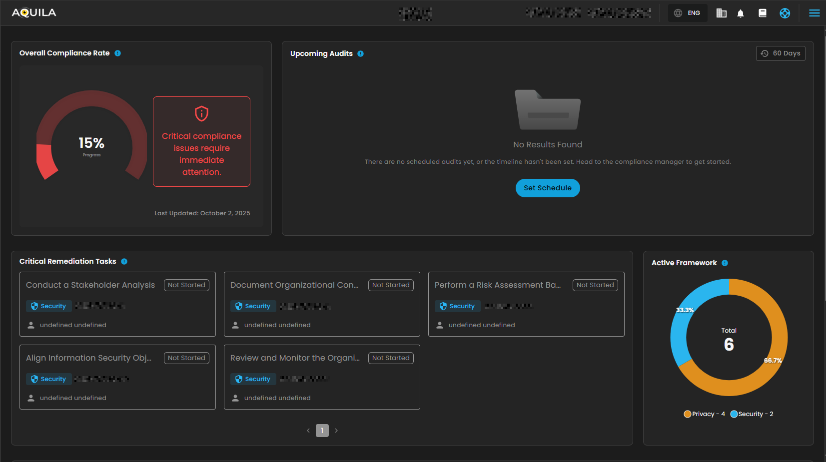 - Dashboard – Real-time view of overall compliance rate, upcoming audits, critical remediation task, and active framework.