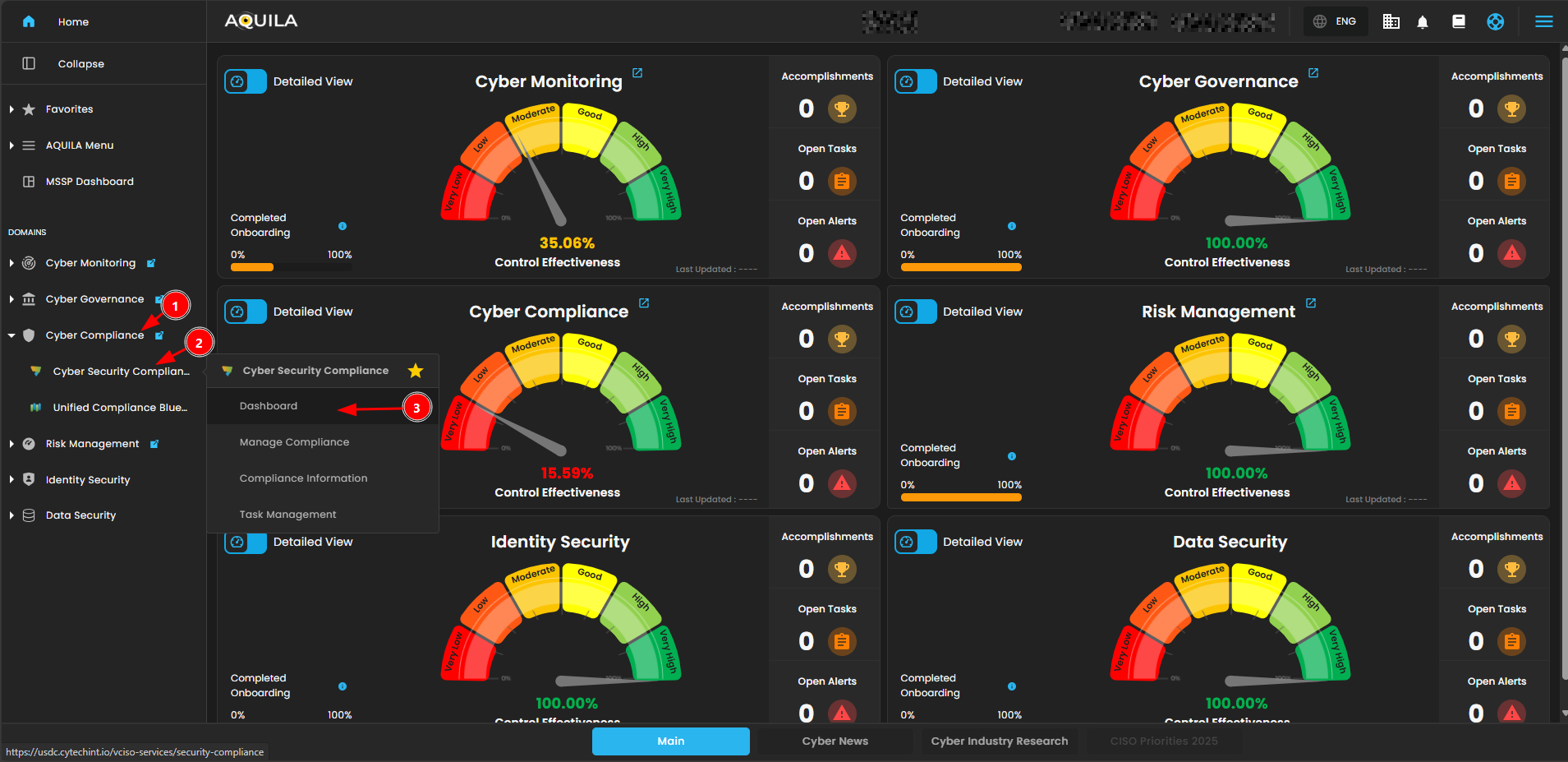 Step 2: In the left side panel, you can see the list of six (6) domains, kindly choose and click the Cyber Compliance (Domain) -> Cyber Security Compliance (Module) -> Dashboard (Sub Module)