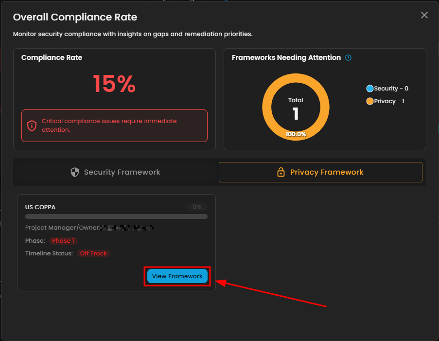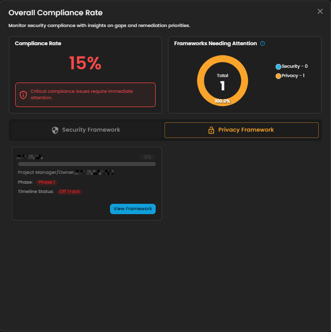 Upon clicking the Overall Compliance Rate, the dashboard shows a detailed compliance overview, highlighting critical issues that require immediate attention, identifying frameworks that need action, and providing insights into their progress and timeline status.