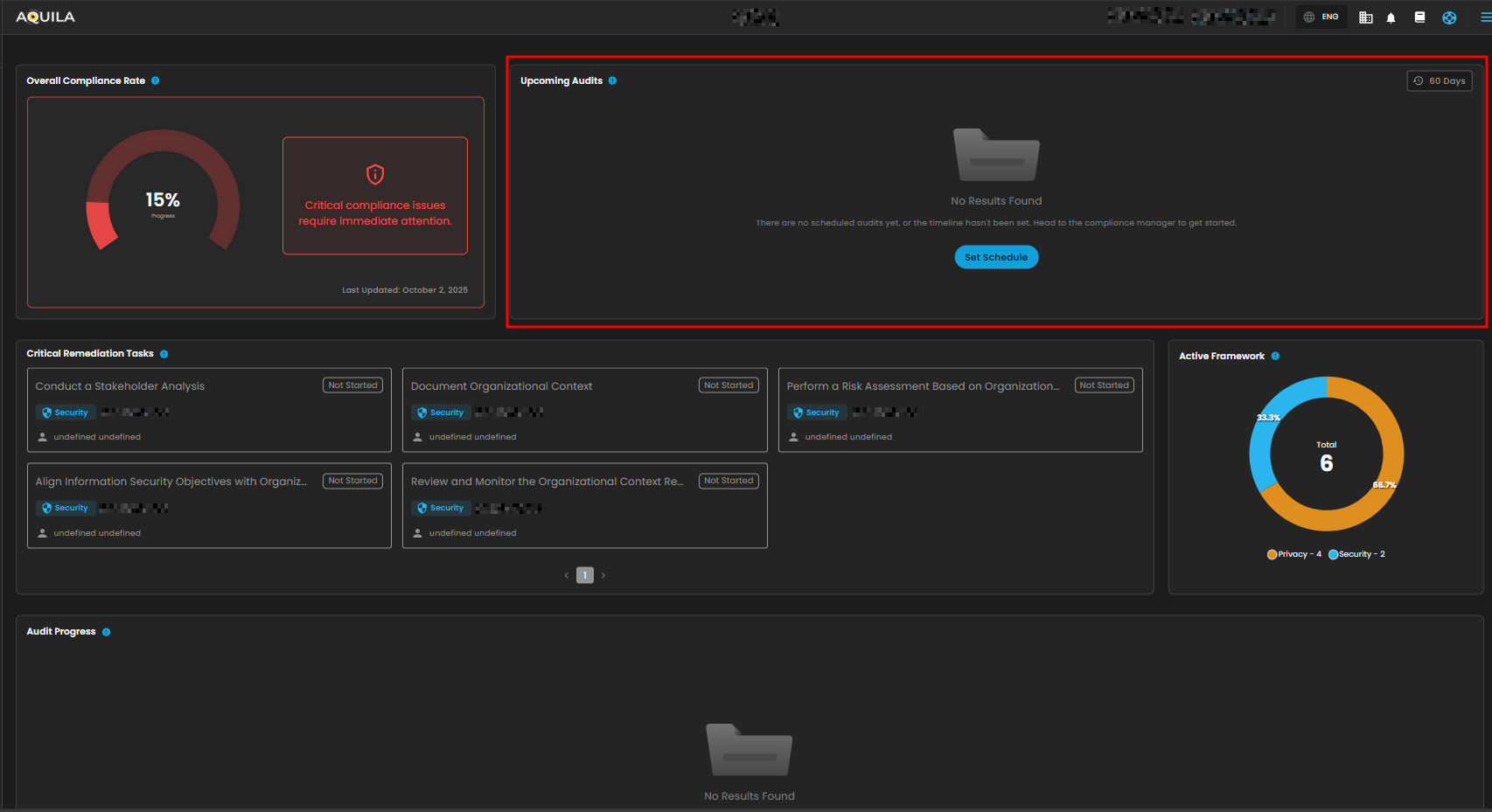 The Upcoming Audits section helps track and prepare for compliance audits by showing scheduled audits within a chosen timeframe (7–90 days).