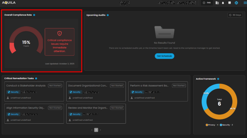 - Dashboard – Real-time view of overall compliance rate, upcoming audits, critical remediation task, and active framework.