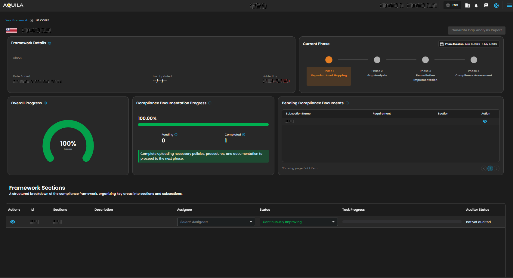 If you click also the “View Framework” you’re taken to a detailed compliance framework dashboard for the ISOs. This page gives you a breakdown of the framework status, and you can generate Gap Analysis Report.