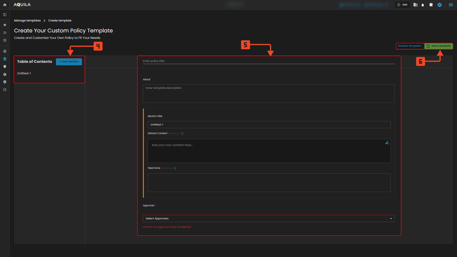 - The Create Custom Policy Template section allows users to design and customize their own policies. It provides a user-friendly interface where you can enter a policy title, description, and content. The template can be structured with different sections, and each section can include titles, default content, and field hints. This section also enables the selection of approvers for the policy, ensuring proper review and approval workflows.