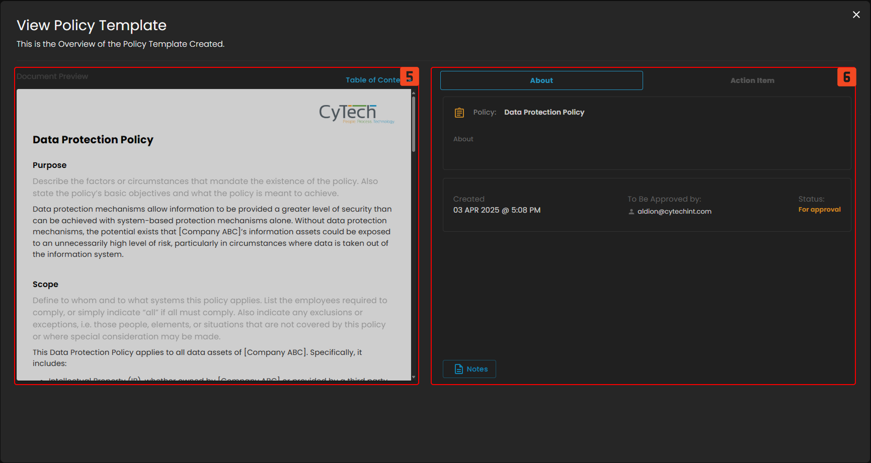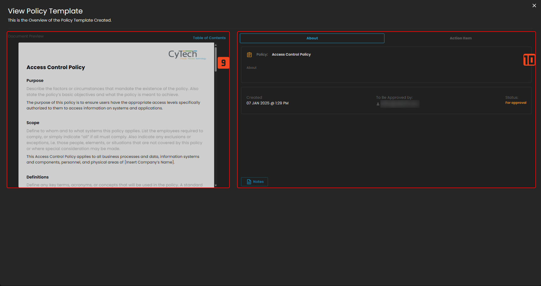 - The About section provides key metadata about the policy template, including its creation date, approval status, and the individual responsible for approval. This section offers a quick reference to understand the template’s background and current status.
