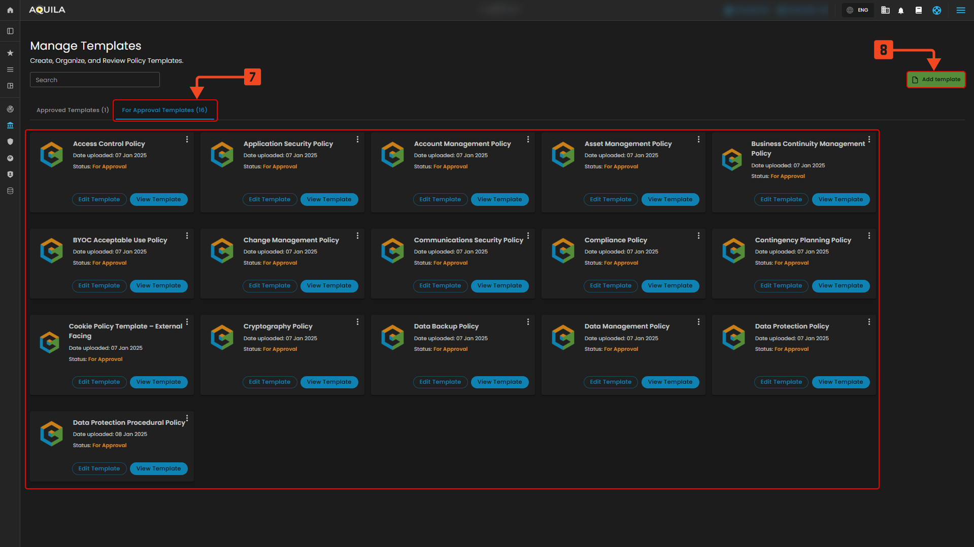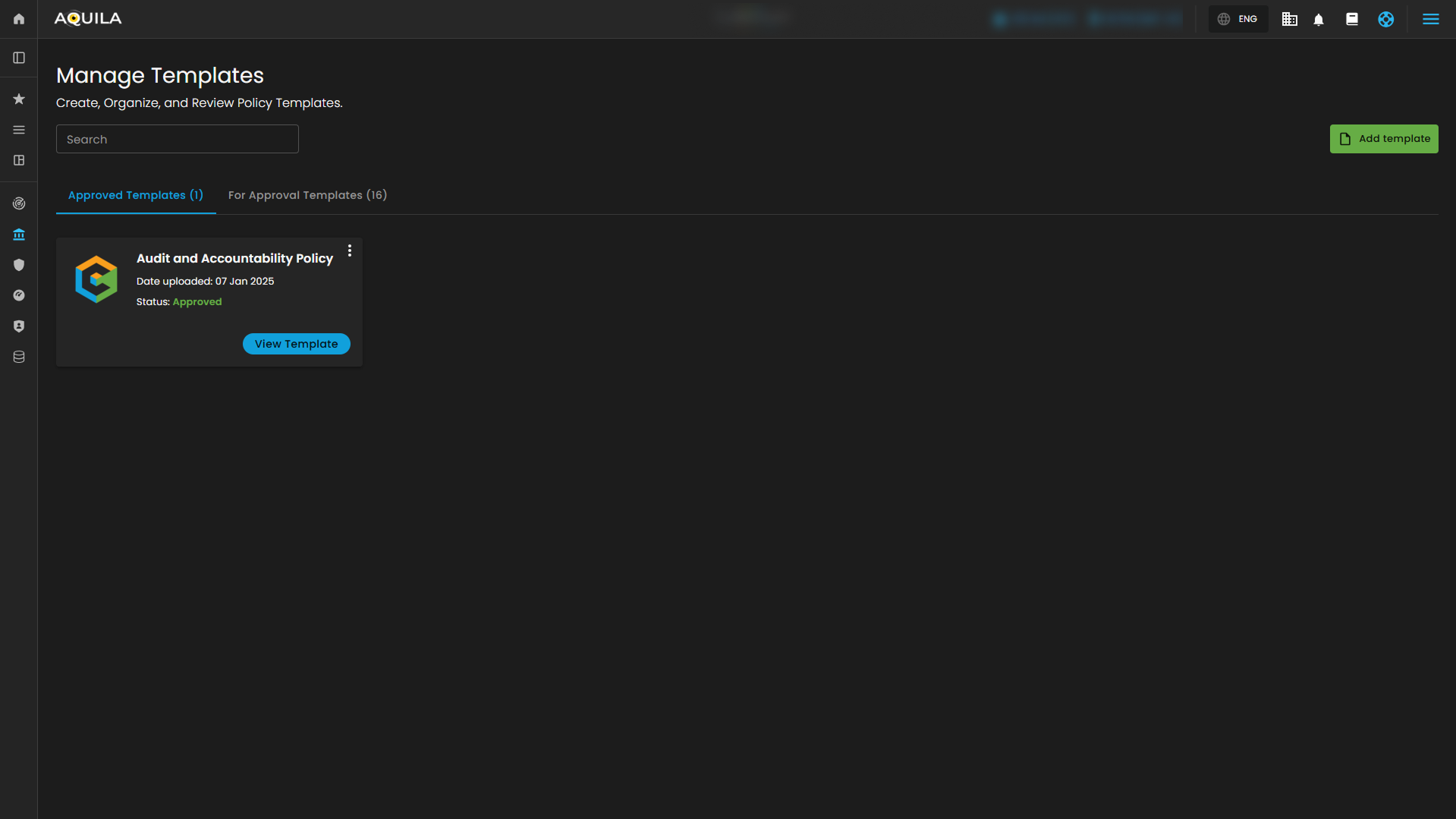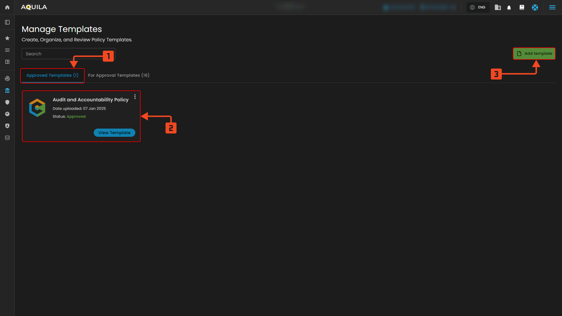 - The Add Template button allows users to upload a new policy template. Clicking this button initiates the process of adding a fresh template to the system for review and approval.