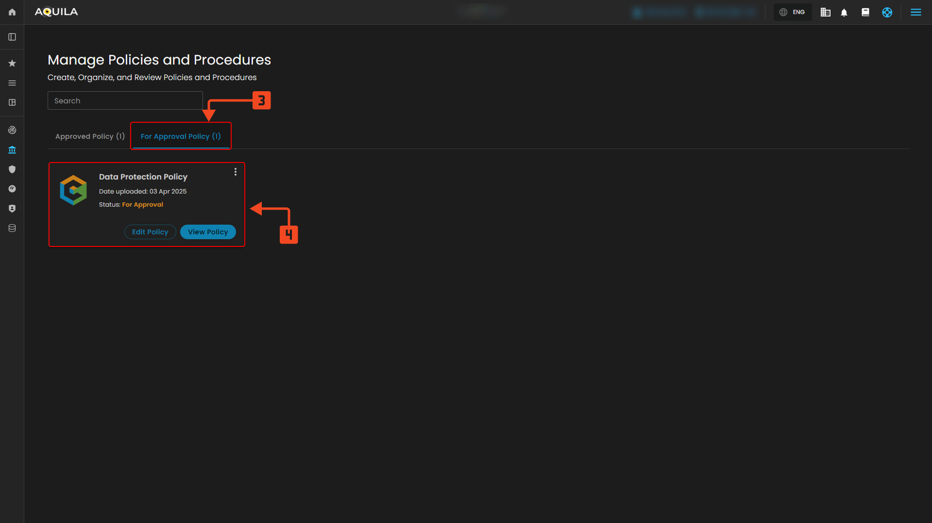 This section allows you to access and manage all policies that have been approved. It enables easy navigation to view the status and other relevant details of the approved policies. You can also take actions based on the approval status to ensure compliance and organization-wide visibility.