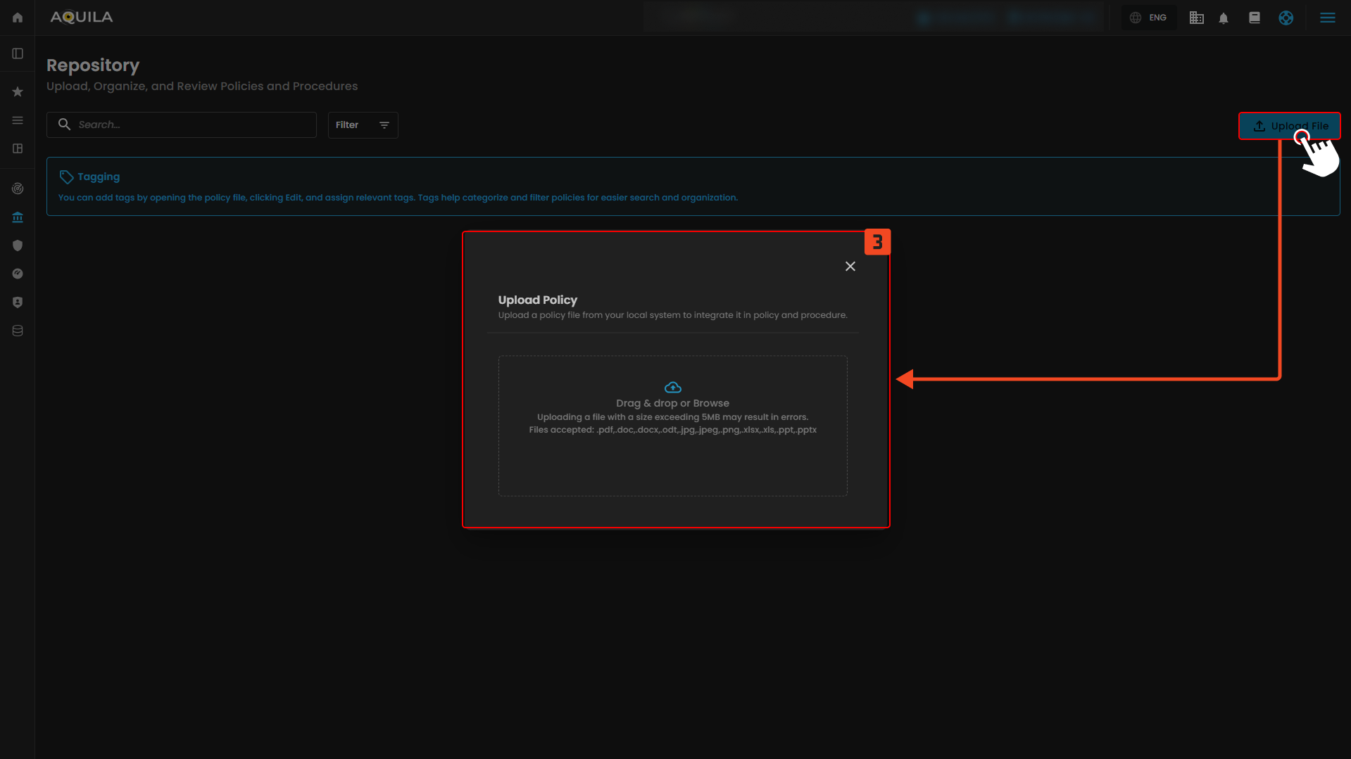 - The Upload Policy section allows users to add policy files from their local system into the policy and procedure management system. Here's an overview of the functionality. Drag & Drop or Browse, Users can either drag and drop the file directly into the upload area or click a "Browse" button to select the file from their file explorer. This gives flexibility in how users choose to upload documents.