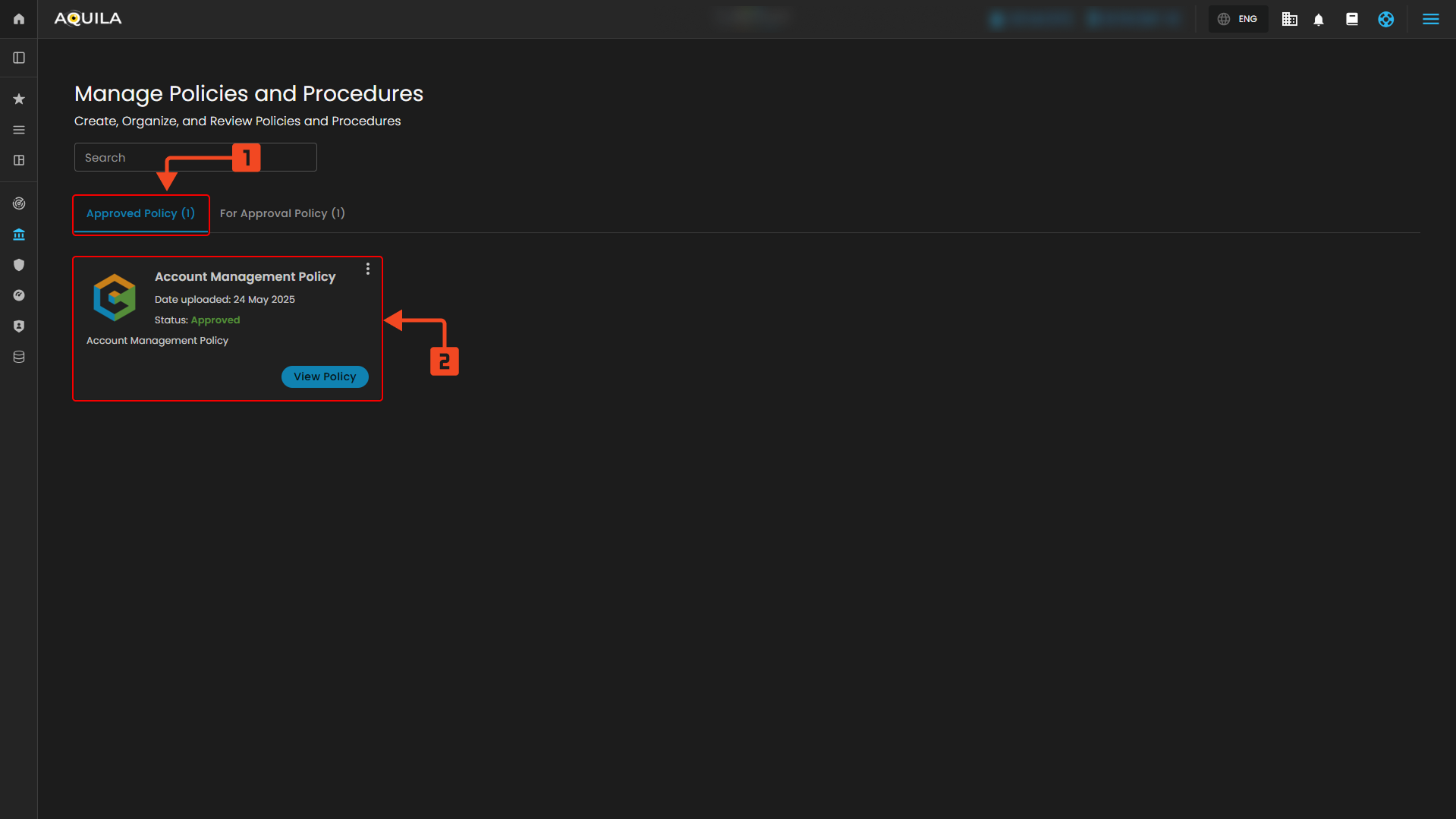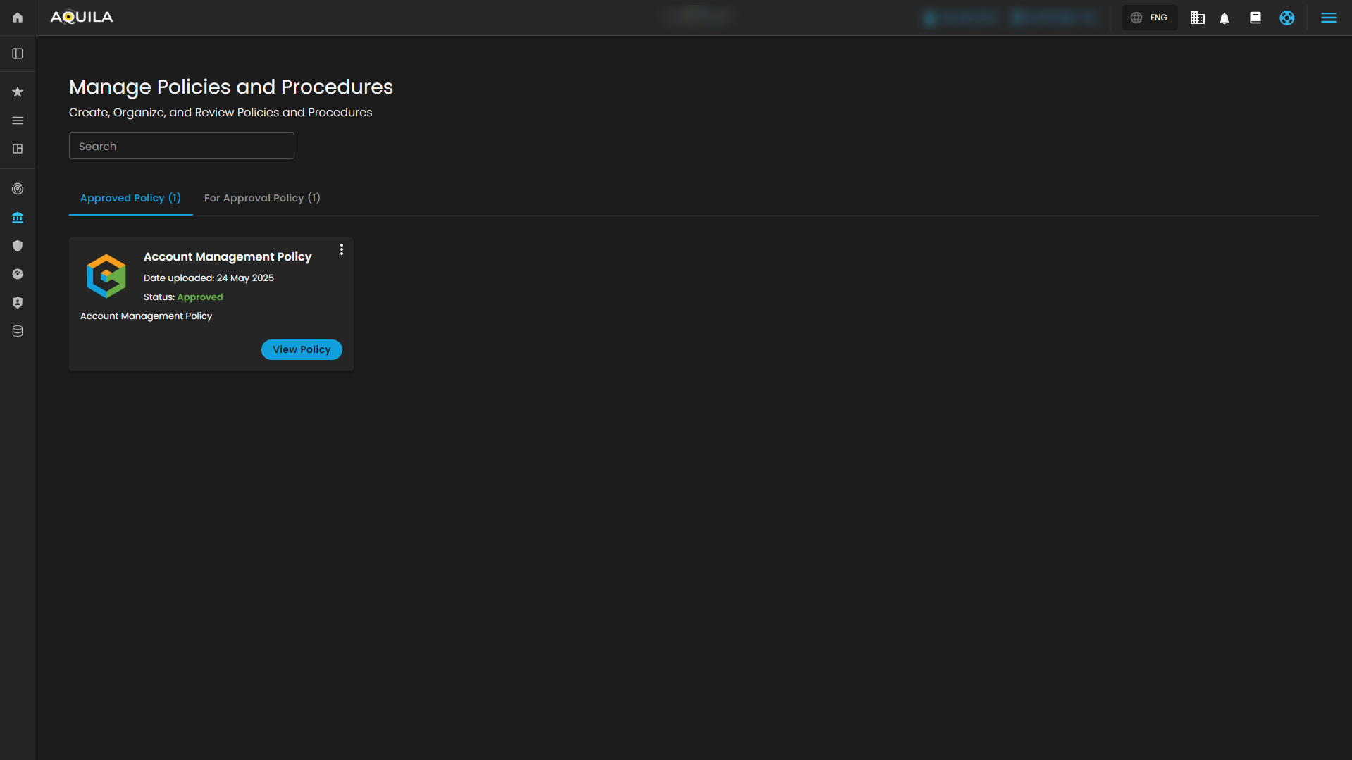 In the Manage Policies and Procedures Page, you can view and manage the organization’s policies. This includes managing approved policies and policies that are awaiting approval. You can interact with policies based on their current status and manage them accordingly.