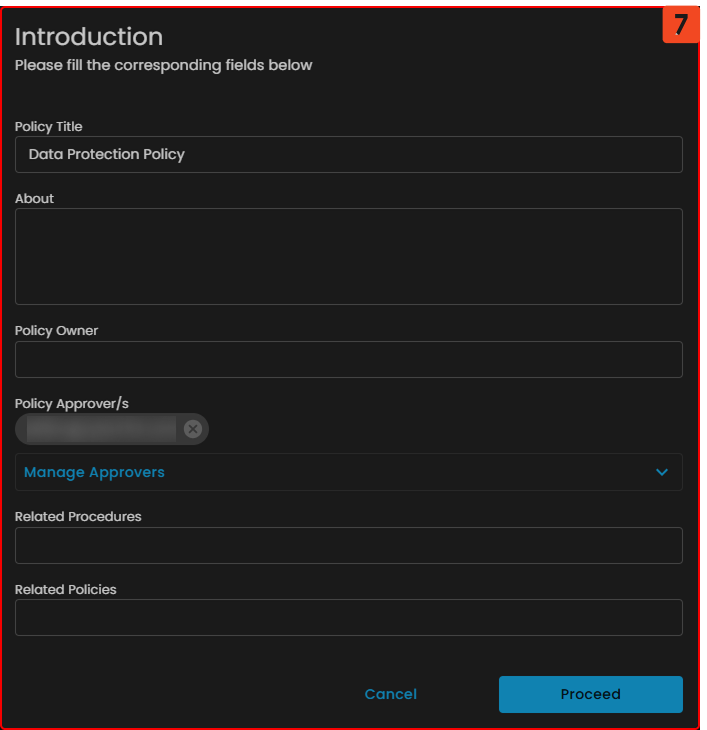 This section contains fields for the user to fill out important details about the policy, including the title, description, owner, approvers, related procedures, and related policies. It allows users to provide necessary information to set up or update a policy before proceeding further in the workflow.