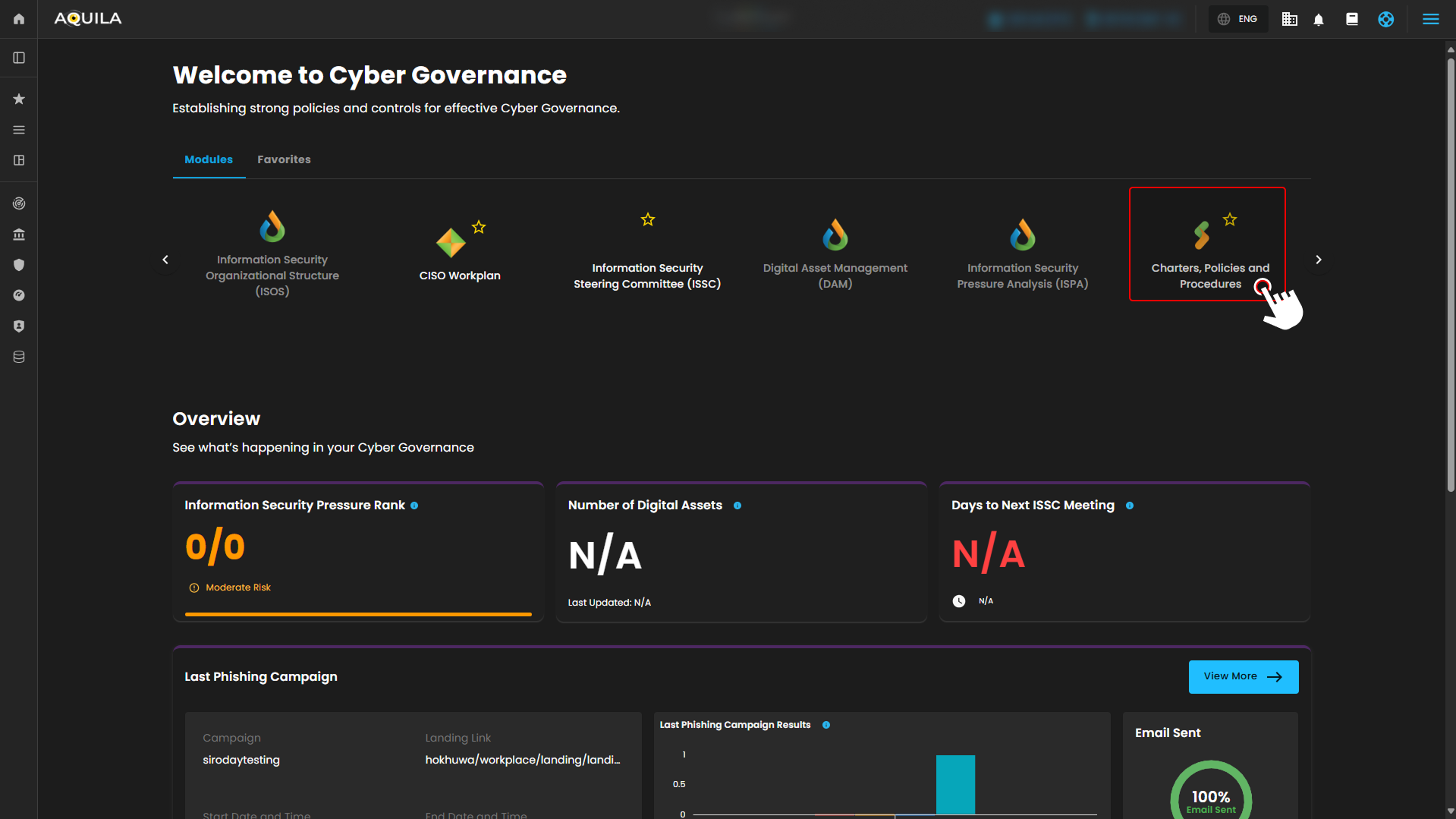 In the Charters, Policies, and Procedures Dashboard, you can track and manage ongoing tasks and projects related to cybersecurity and compliance initiatives. The dashboard includes multiple sections that provide a comprehensive view of policy status, acknowledgements, and recent activities.