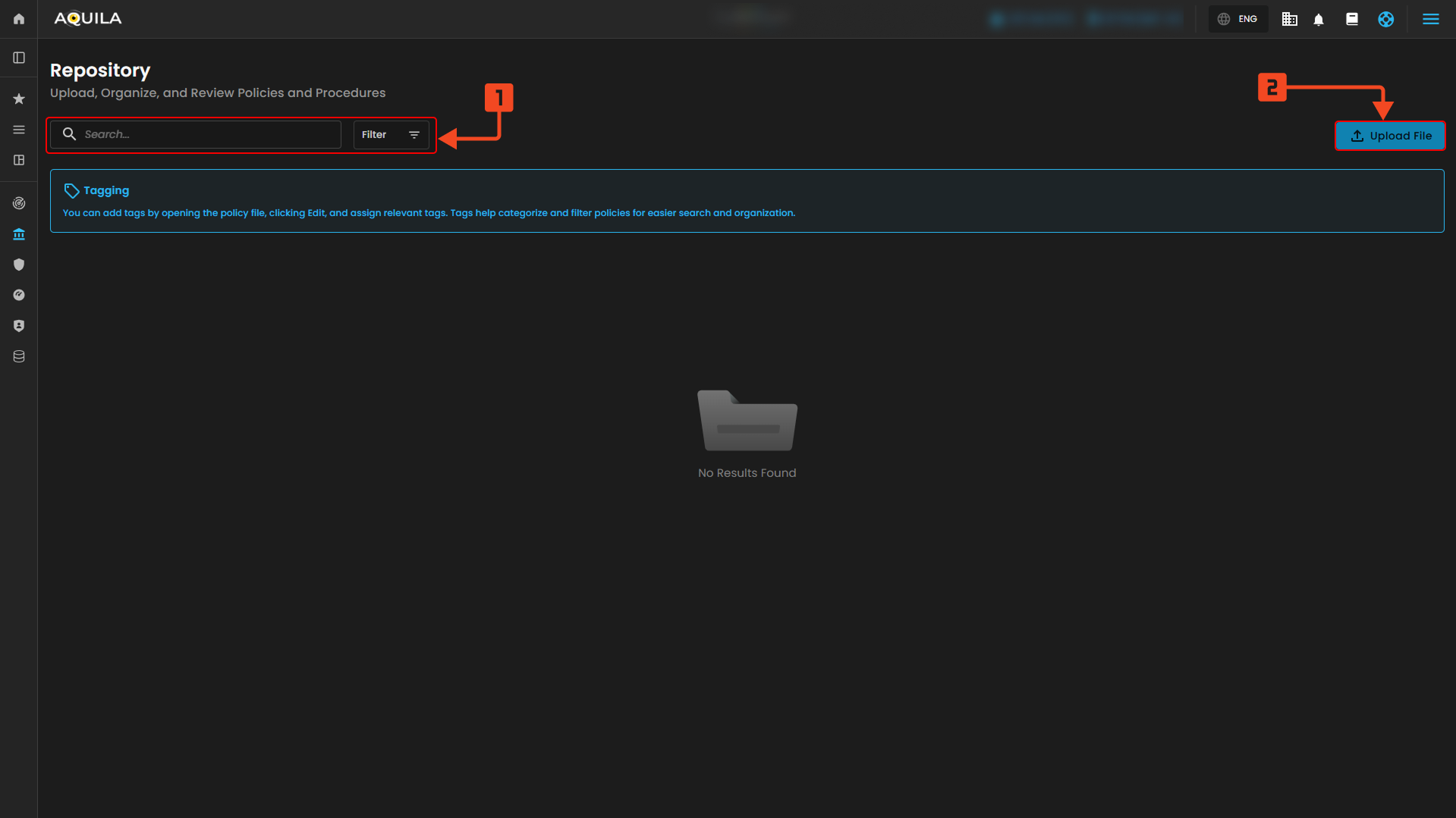 Allows users to search for specific policies or documents within the repository. The filter option helps narrow down results based on specific criteria, enabling users to easily find relevant files.
