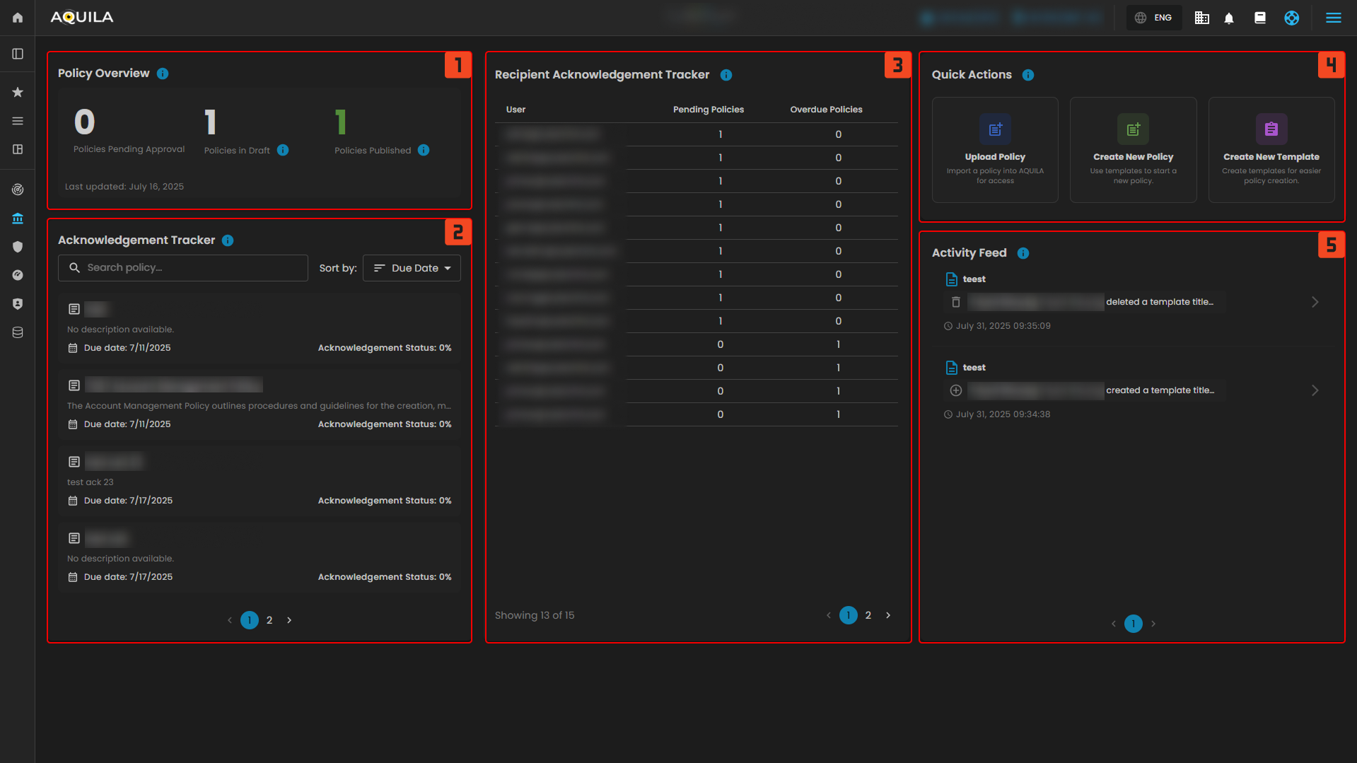 - The Quick Actions section provides easy access to key functions. Here, you can upload new policies, create new policies using templates, or create new templates for easier policy creation. This section streamlines the process of managing and creating policies.