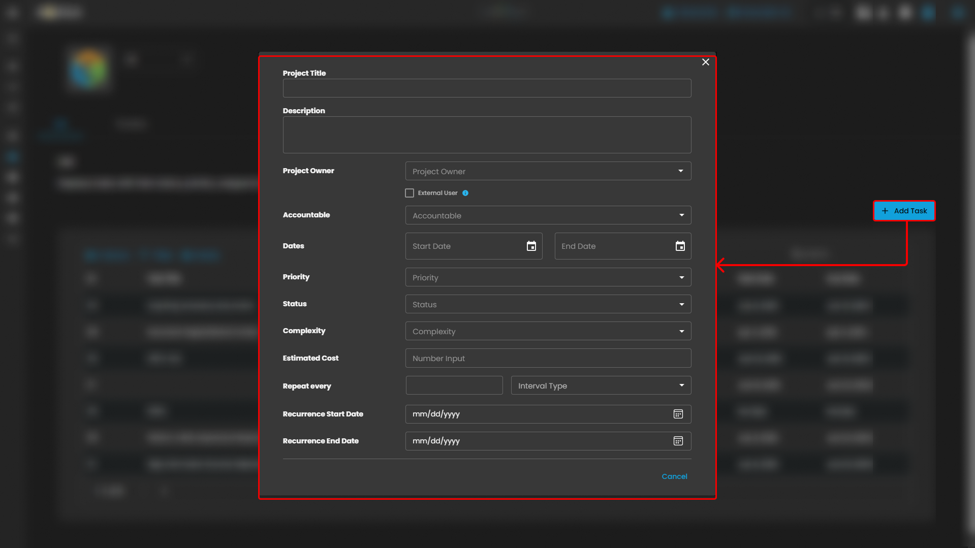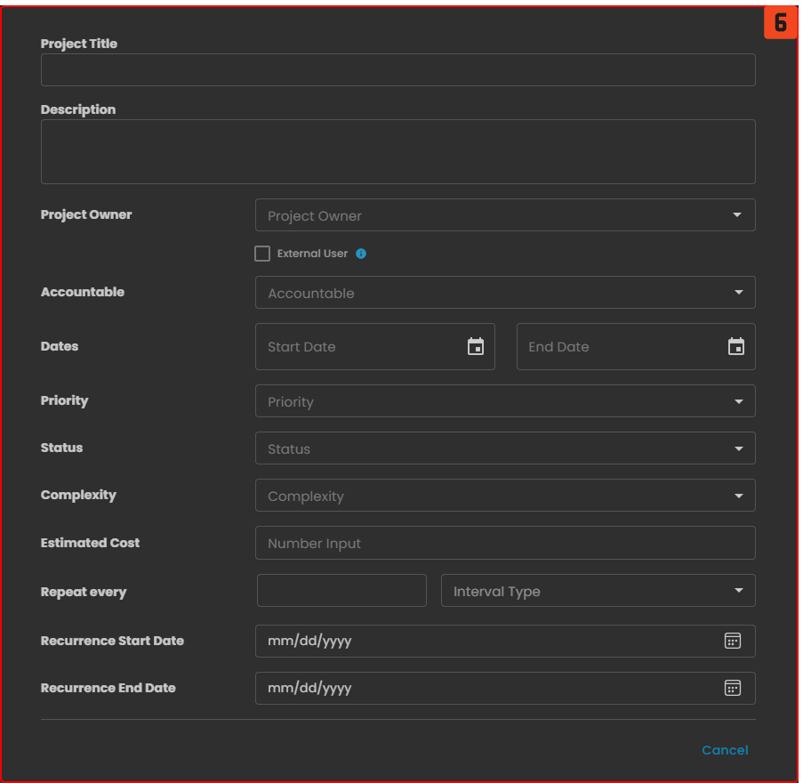 - The Project Details Form allows you to add or edit a project. You’ll enter the Project Title and a brief Description. Then, select the Project Owner (who manages the project) and the Accountable person (who ensures the project’s success). You’ll set the Start Date and End Date, choose the Priority, and update the Status. You can also note the Complexity, provide an Estimated Cost, and set the project to Repeat Every if needed, with specific start and end dates.