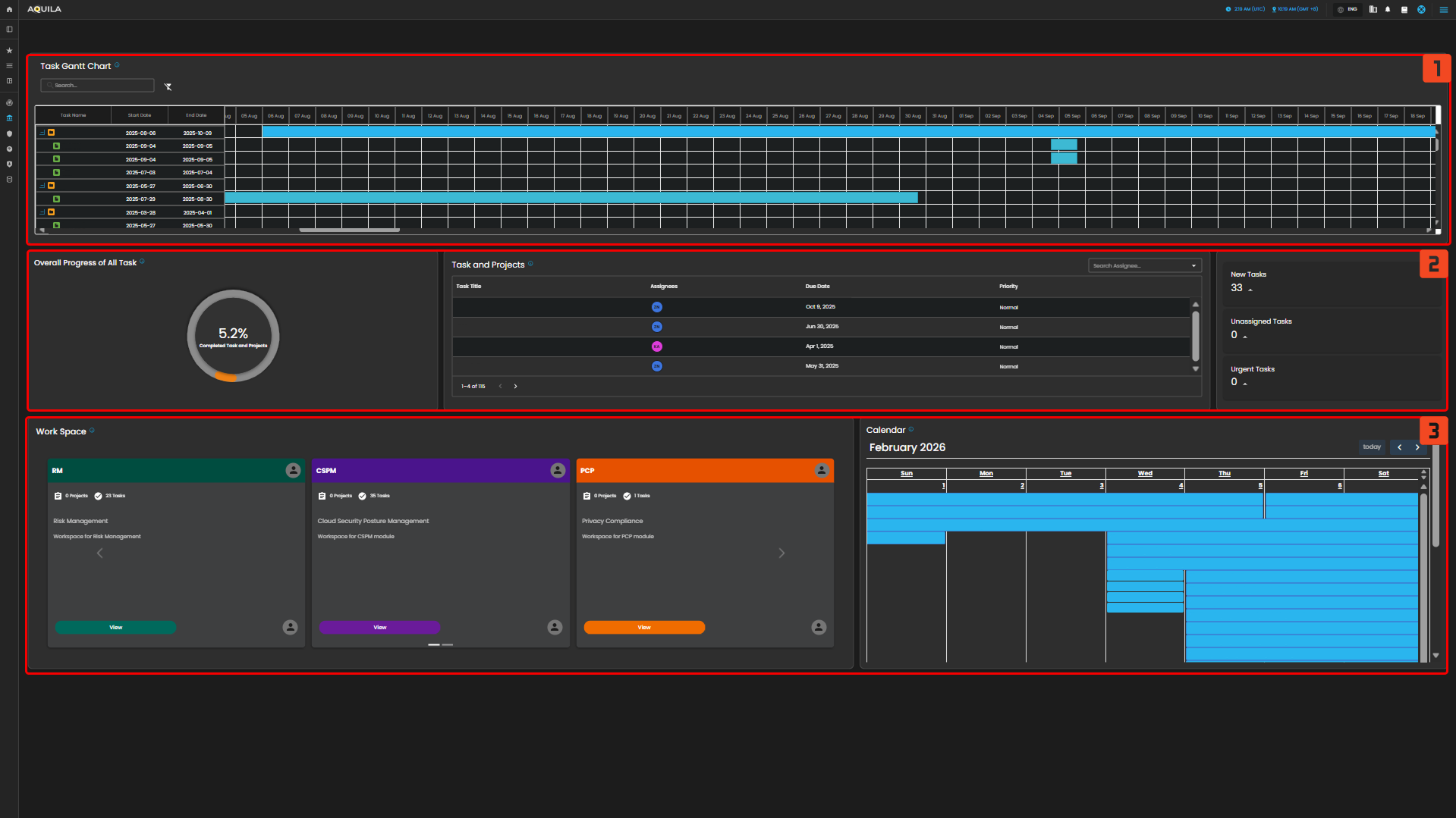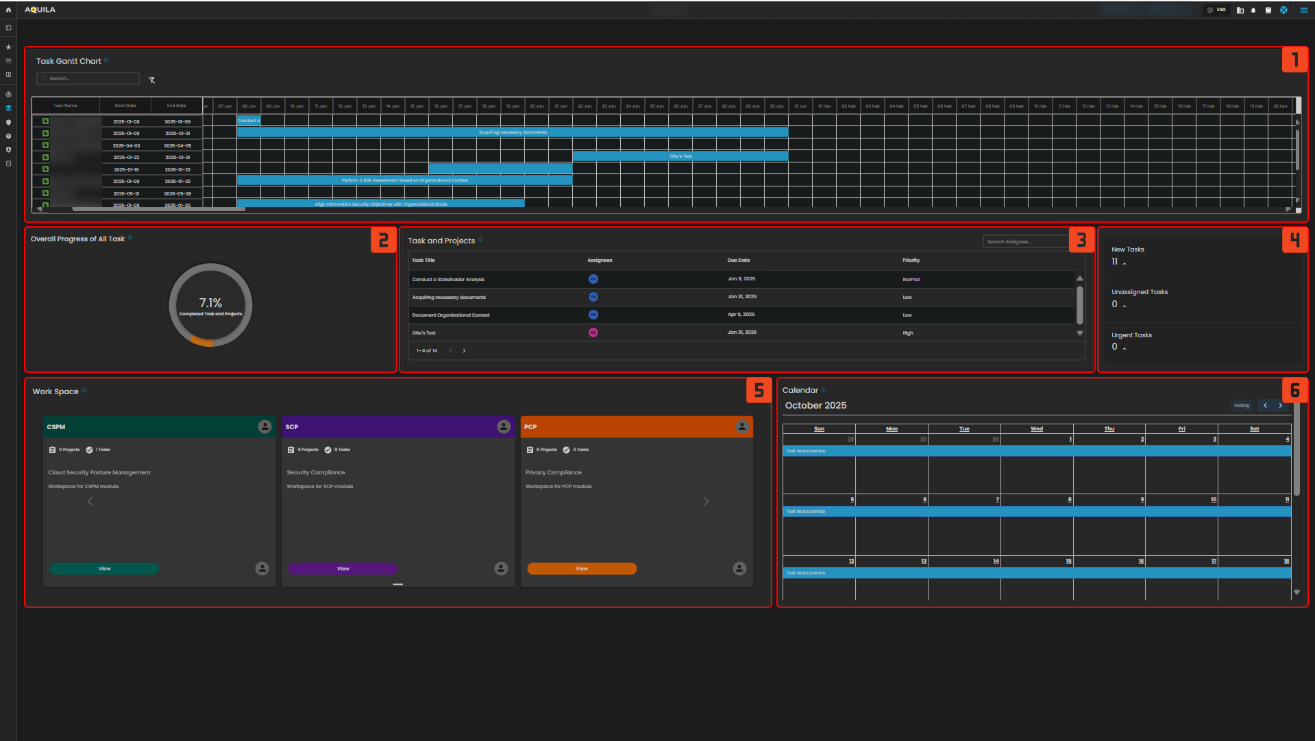 The Workspace presents all active cybersecurity-related tasks in a list format. This allows users to view essential task details, such as task titles, assignees, priority, estimated costs, statuses, and key deadlines. The dashboard offers an intuitive way to manage the tasks and monitor their progress throughout the year.