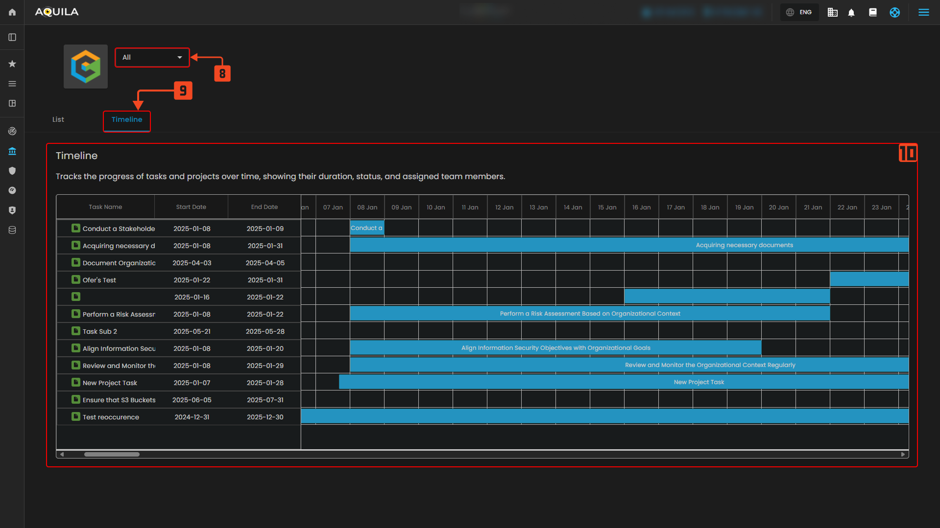 - The List View allows users to view all tasks in a tabular format. This view gives a quick overview of the task names, start and end dates, and allows users to track the progress of each task. The Timeline View is also available here, which presents tasks over time in a visual timeline format.