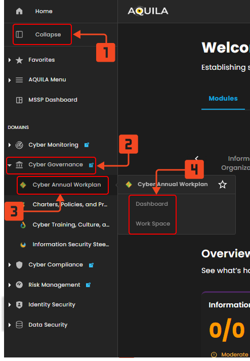 Step 4: Hover into leftmost panel to view all the Cyber Governance sections. This Process is applicable in all navigating into a Module.
