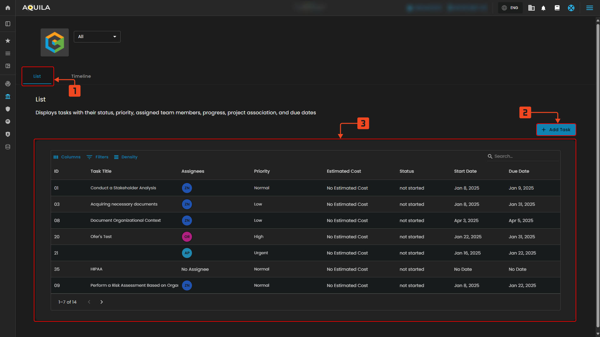 - This section gives you the option to view tasks either in a List View or Timeline View. The List View is the default and displays all tasks with their essential details such as status, priority, assignees, and due dates. It's a quick way to check task details in a tabular format.