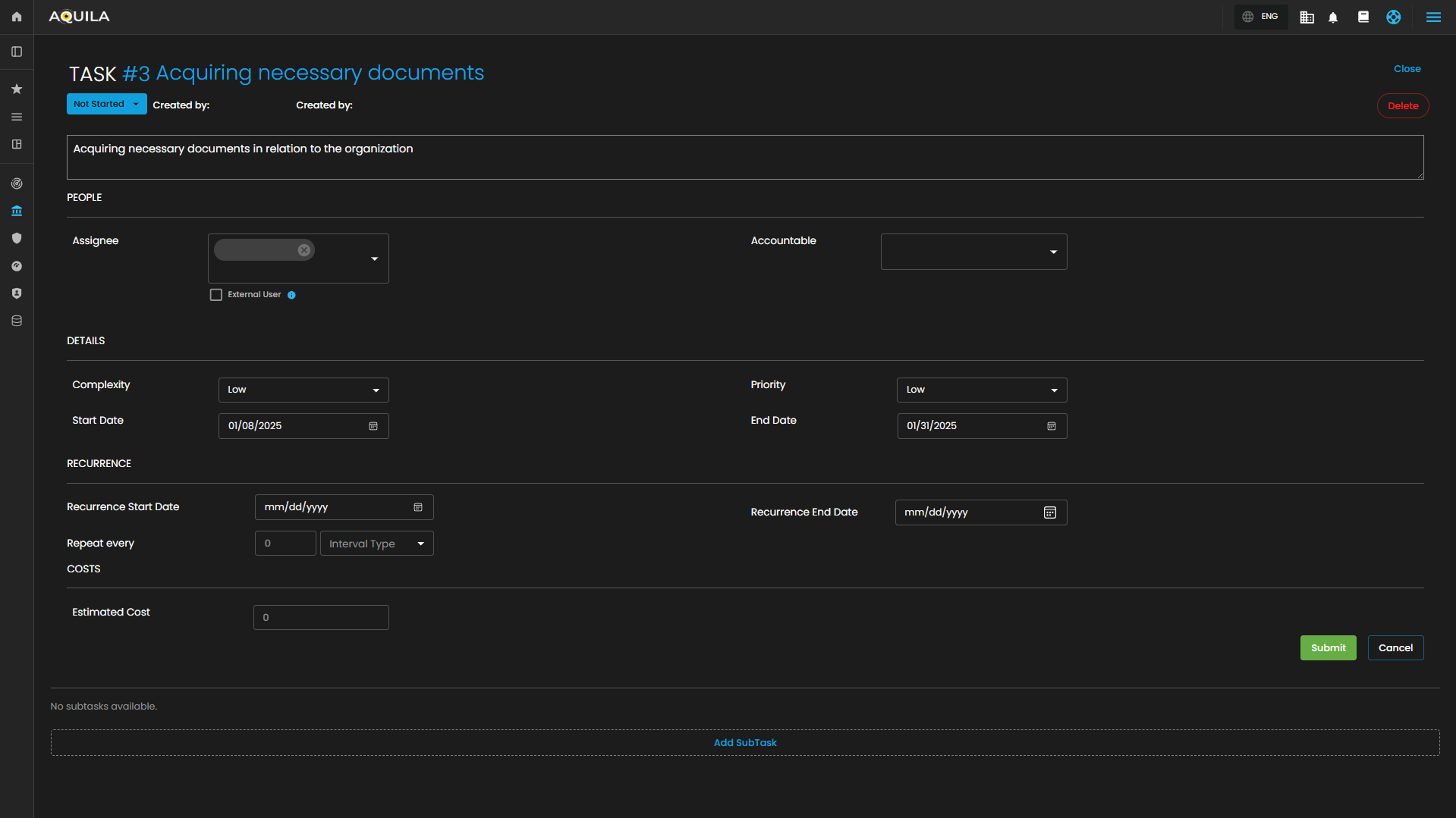 - The Task Details Form is used to add or edit a task within a project. You’ll enter the Task Title and Description, assign an Assignee, and select the Accountable person. You’ll set the Start Date and End Date, choose the Priority, and update the Status. You can also note the Complexity, provide an Estimated Cost, and set the task to Repeat Every with start and end dates if applicable.