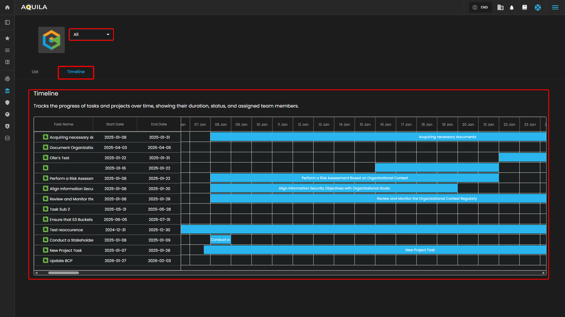 The List View allows users to view all tasks in a tabular format. This view gives a quick overview of the task names, start and end dates, and allows users to track the progress of each task. The Timeline View is also available here, which presents tasks over time in a visual timeline format.