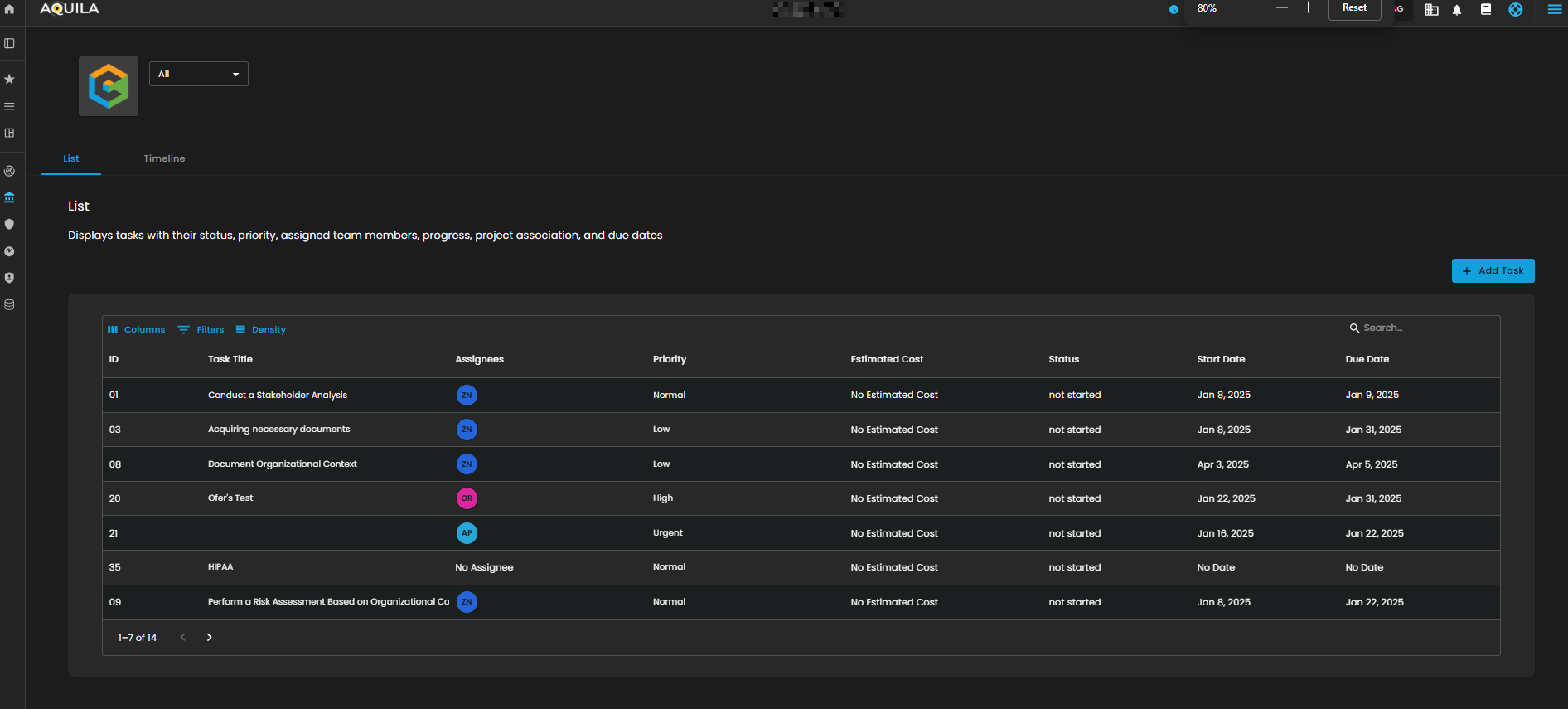 The Workspace presents all active cybersecurity-related tasks in a list format. This allows users to view essential task details, such as task titles, assignees, priority, estimated costs, statuses, and key deadlines. The dashboard offers an intuitive way to manage the tasks and monitor their progress throughout the year.