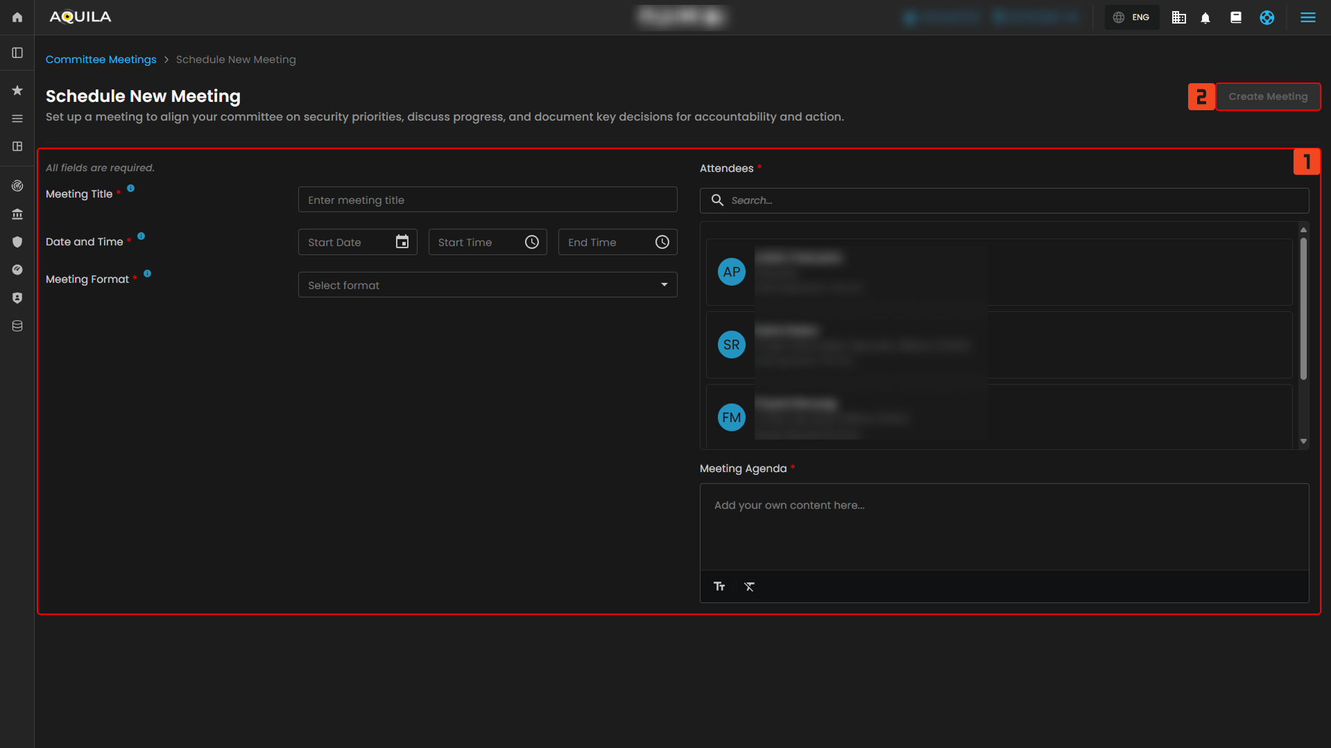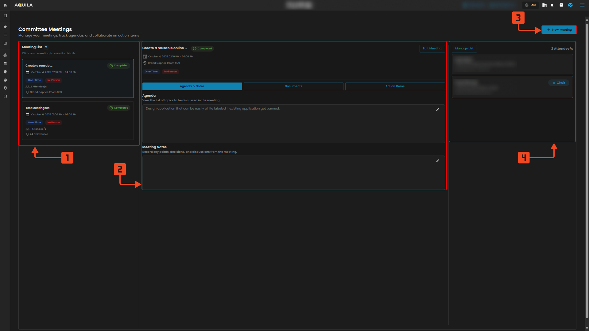 Meeting Management – Allows users to schedule, view, and manage meetings with details such as agenda, notes, attendees, documents, and action items.