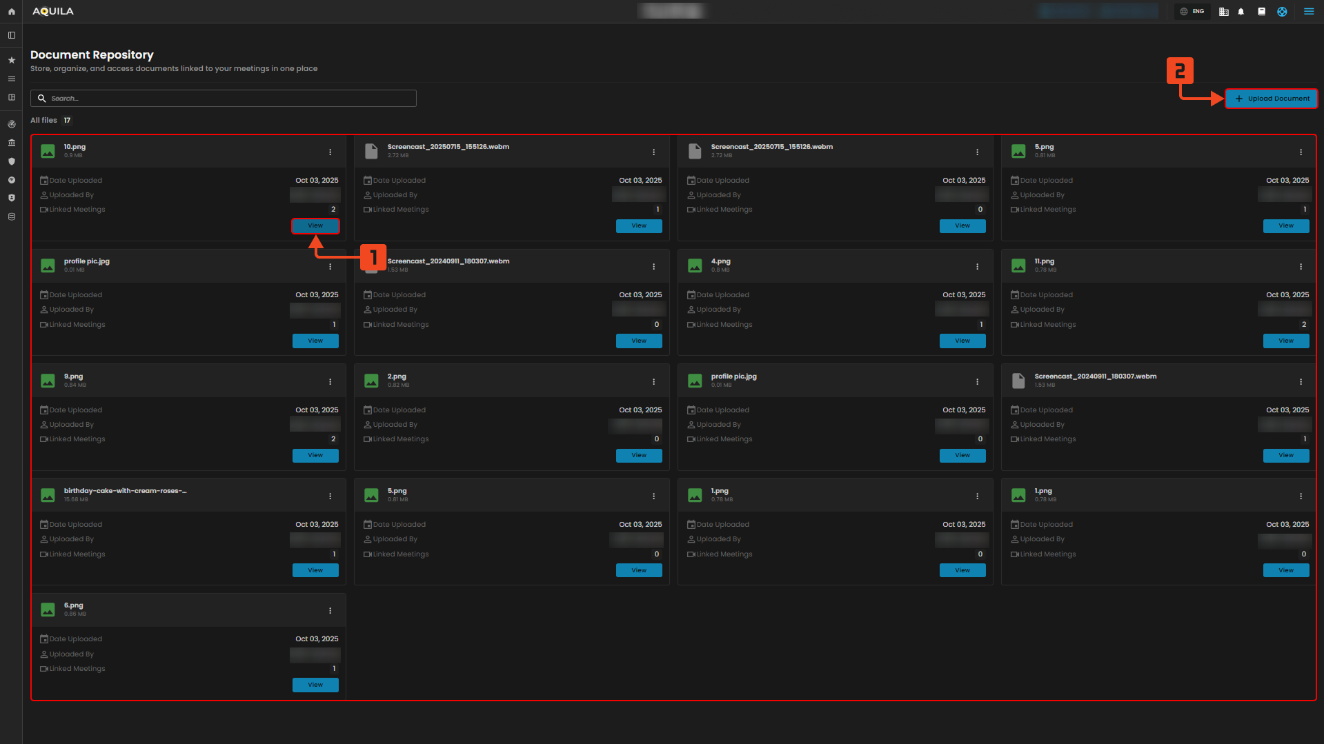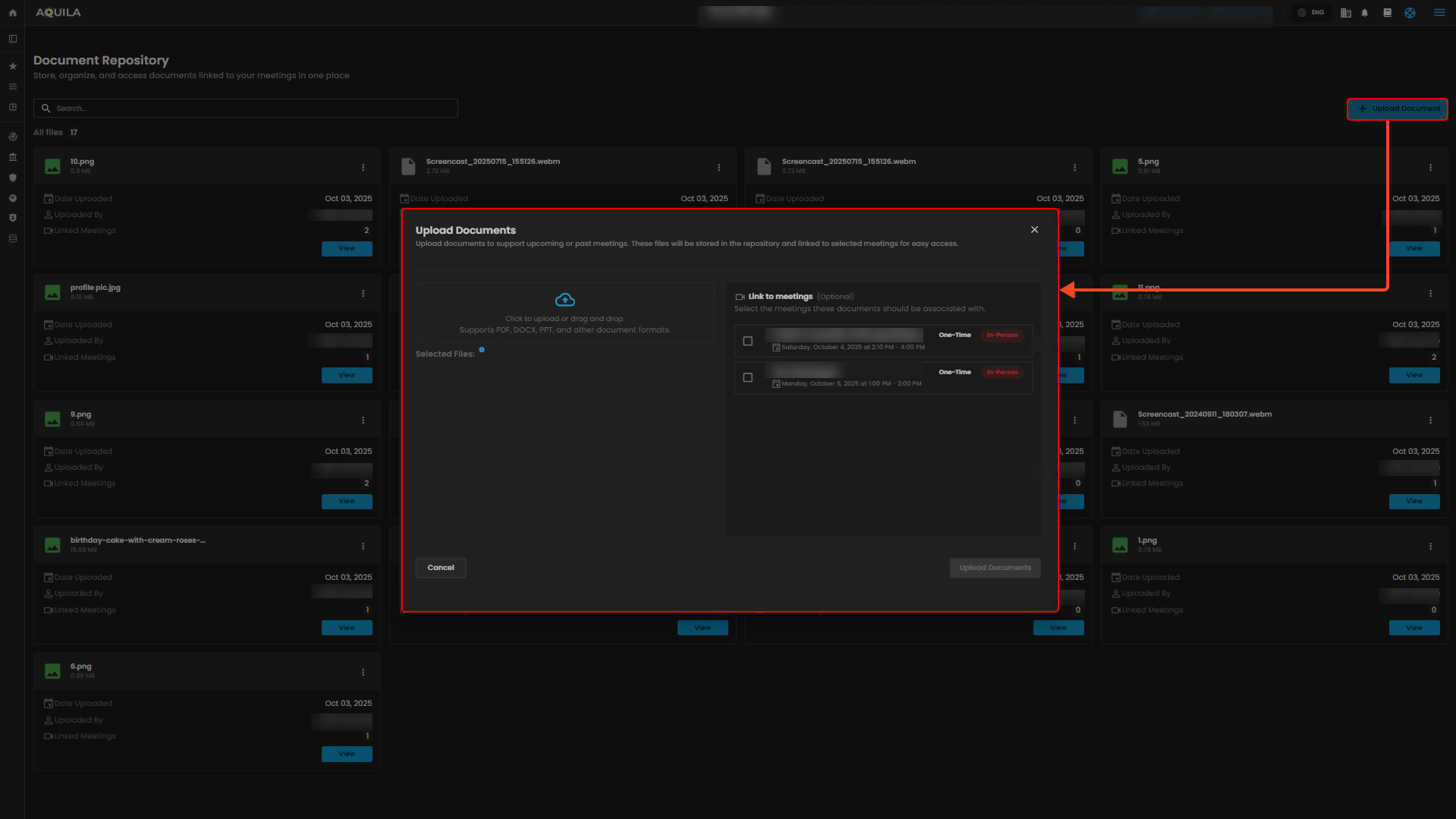 Click the Upload Document button at the top right to open the Upload Documents window. Here, you can drag and drop files or click to browse and select them from your device. Supported formats include PDF, DOCX, PPT, and other document types. You can also choose to link the uploaded files to specific meetings for easier tracking and access. Once you’ve selected your files and linked any meetings, click Upload Documents to add them to the repository.