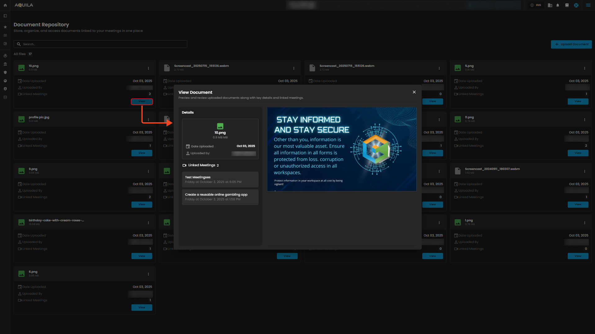 When you click View on a file in the Document Repository, a document window opens in the center of the screen. This window displays the file’s details, including its name, upload date, uploader, and the linked meetings it’s associated with. On the right side, you can preview the document to review its contents without downloading it. This feature makes it easy to confirm files, check linked meetings, and access important materials directly within the workspace.