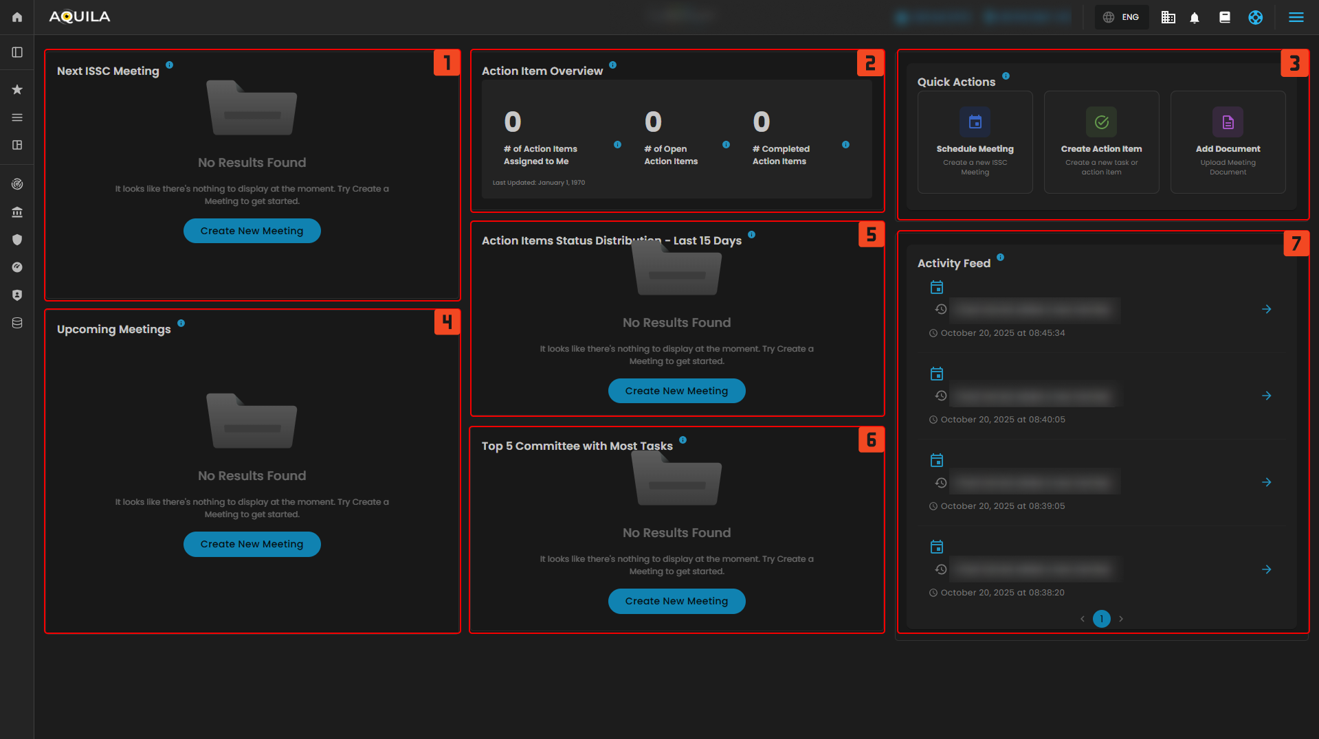 - Activity Feed - A chronological feed of all recent committee-related actions. Includes file uploads, action item creation/updates, and meeting changes. Each entry displays the related meeting, responsible user, timestamp, and an arrow to view full context. Helps maintain transparency and traceability across the ISSC.