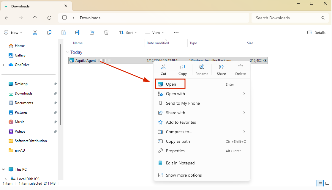 Run the installer and press install to begin the installation of the AQUILA Endpoint Agent.