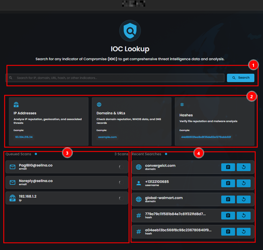 • This section shows a list of the most recent IOC lookups performed. It offers quick access to previously searched indicators, allowing for easy reference or reanalysis if needed.