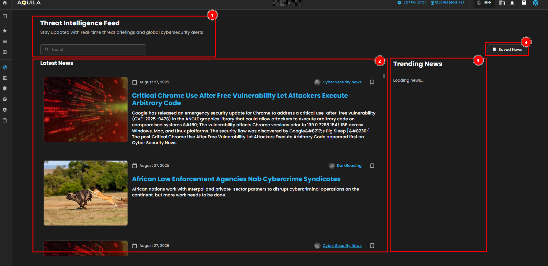 • This section shows a feed of the most recent and relevant cybersecurity news. It includes:
