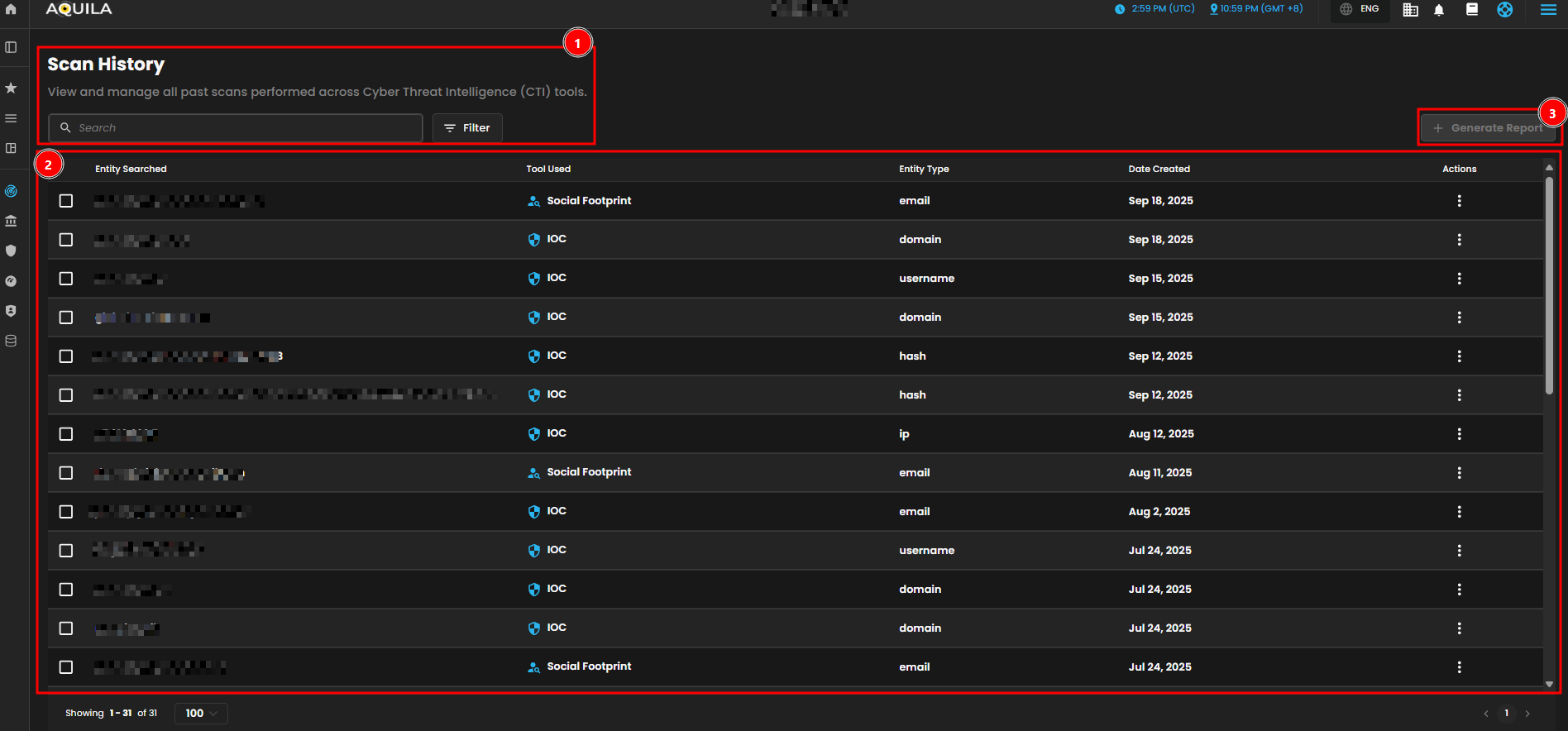 • This section lists all past scans performed across different CTI tools. It provides a quick overview of scans, including: