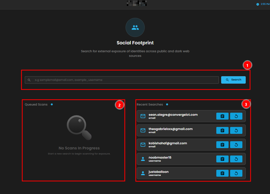 The Social Footprint is designed to monitor and identify the external exposure of identities across public and dark web sources. This helps in tracking possible risks related to individuals’ data that might be publicly exposed.