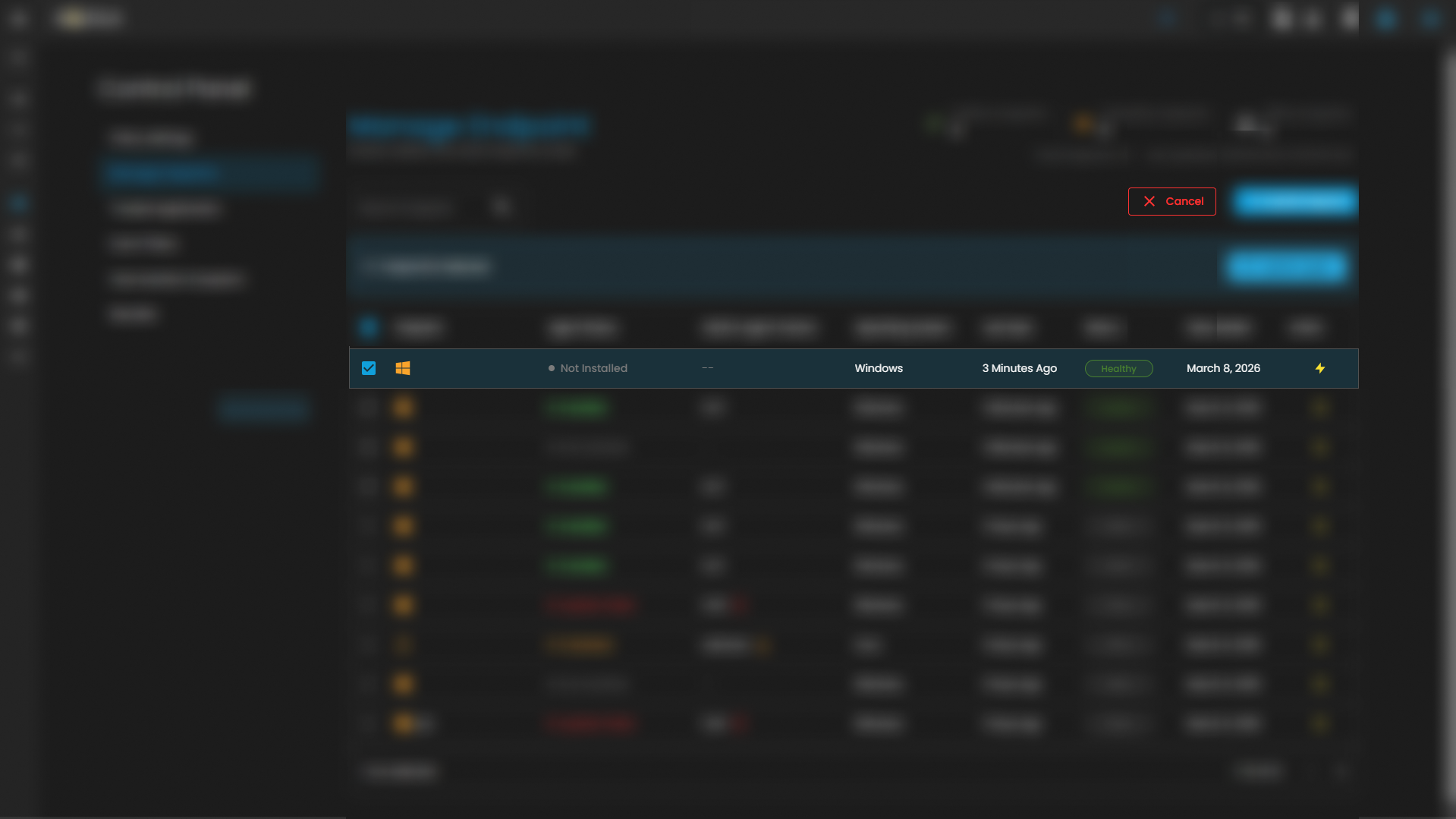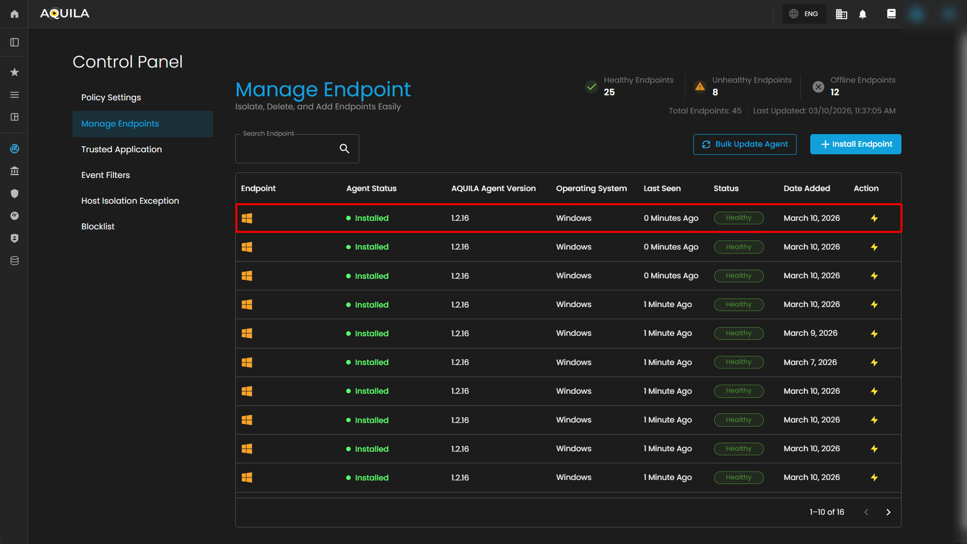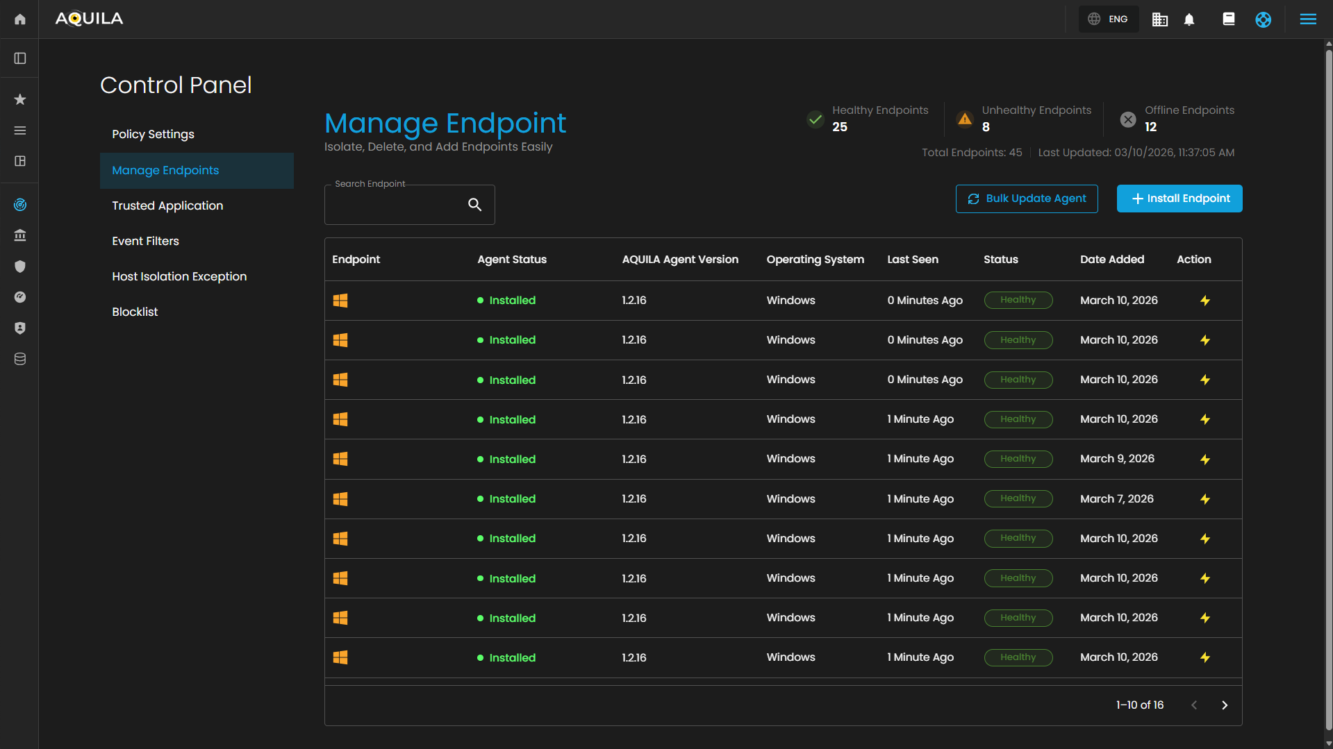 In this section, you will learn how to update AQUILA Endpoint using the Control Panel. The update process is straightforward and can be performed centrally across your entire fleet without the need to touch individual machines. Simply navigate to the relevant section within the Control Panel, select the endpoints you wish to update, and apply the latest version — AQUILA Endpoint will handle the rest automatically.