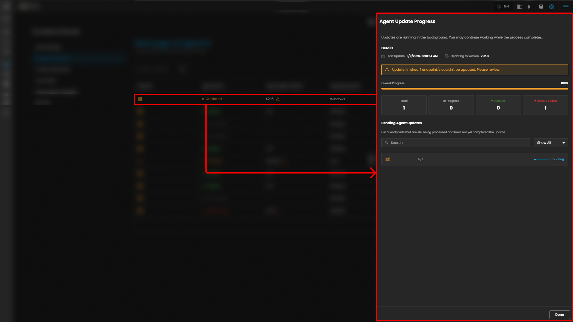 After selecting the endpoint to update, click "Update Now" to open the "Agent Update Progress" sidebar. The sidebar displays agent details, pending updates, and the update progress.
