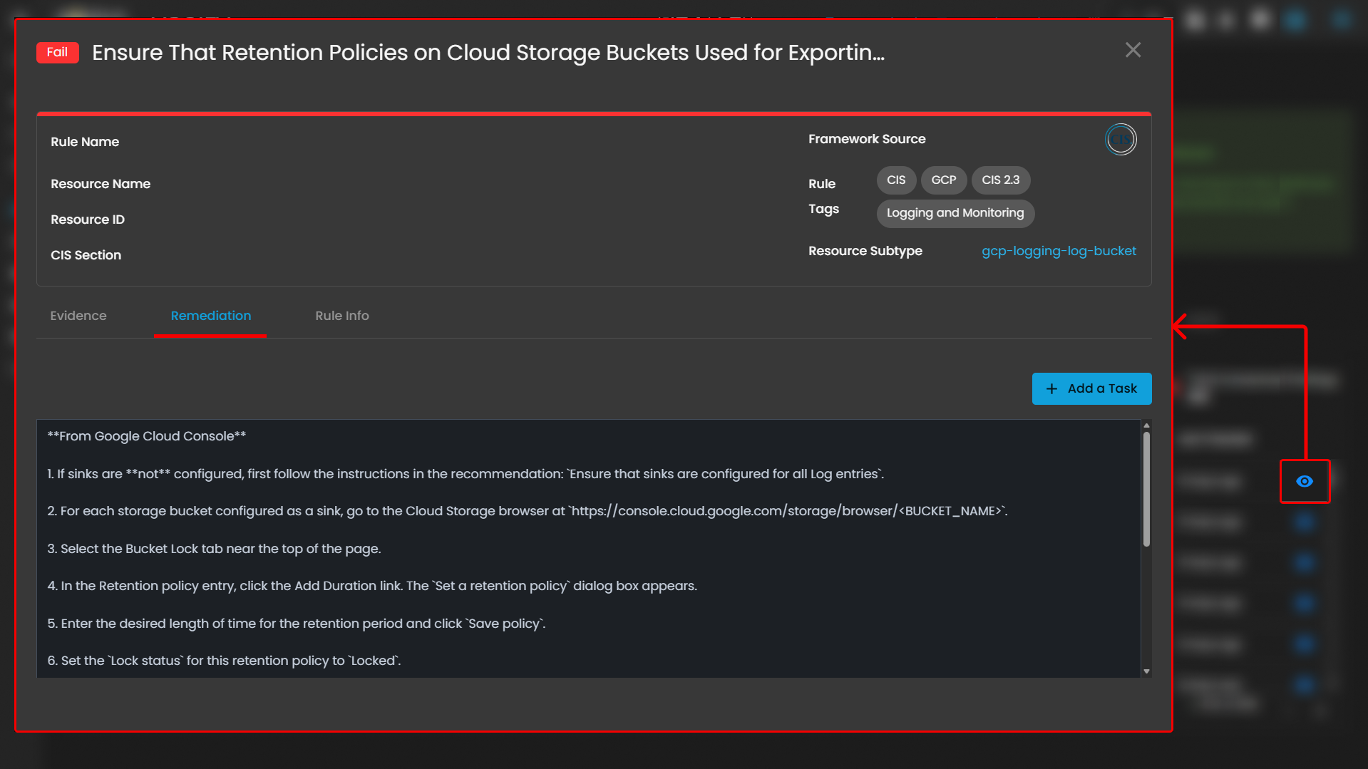 Remediation tab shows all the needed instructions to resolve the misconfigurations, and you can also "Add a Task" function.