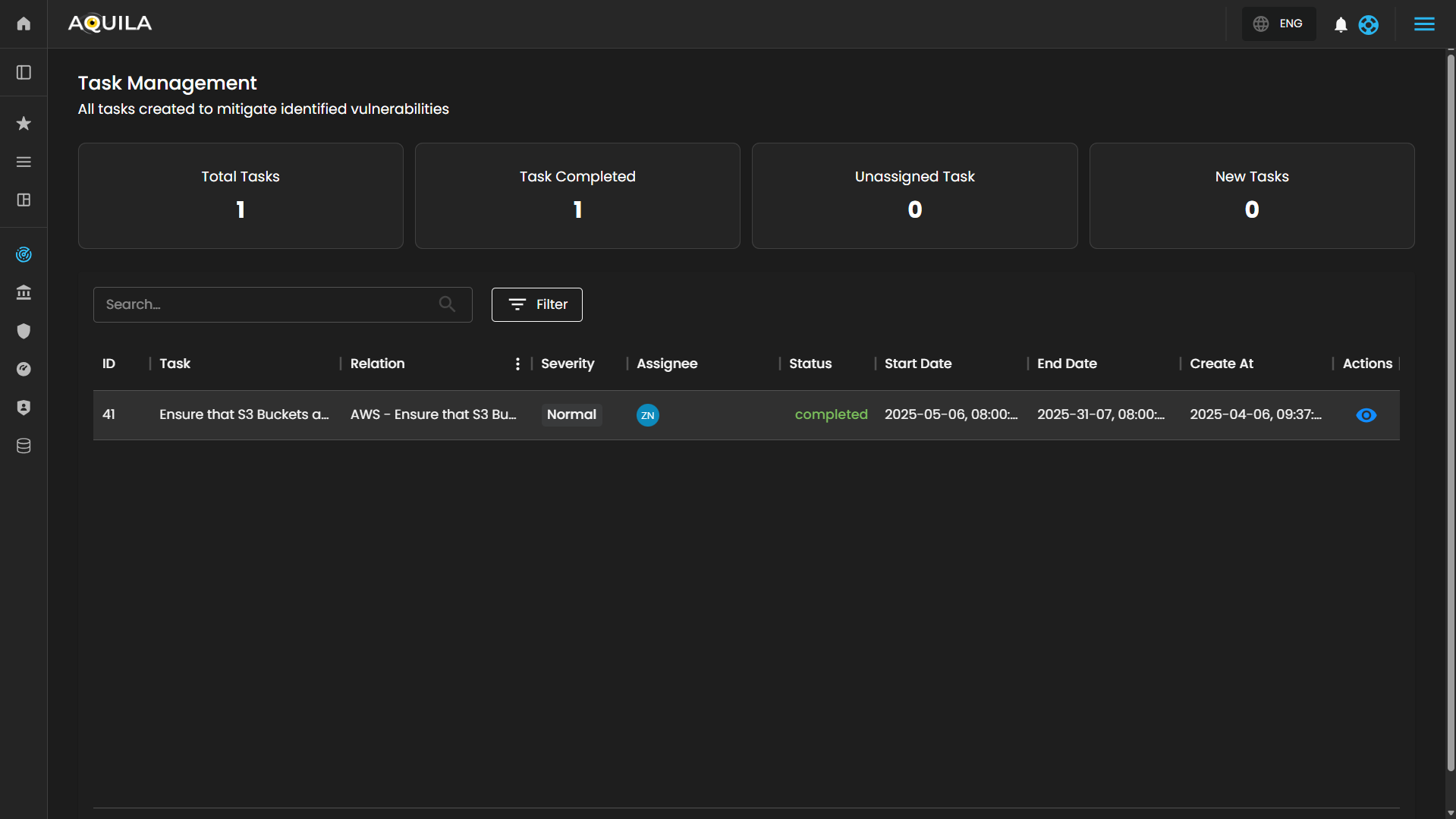 Task Management Section- Displays all tasks created to mitigate identified vulnerabilities from cloud security findings.