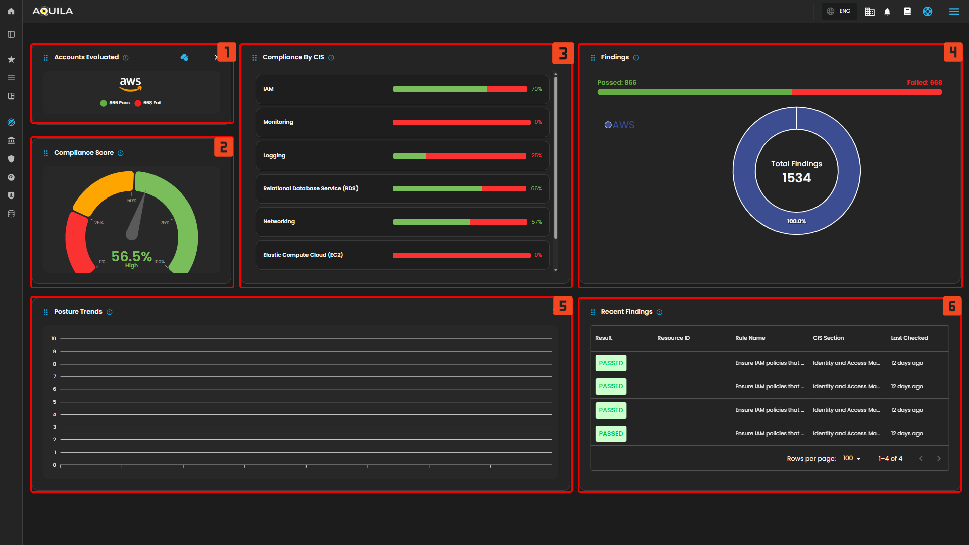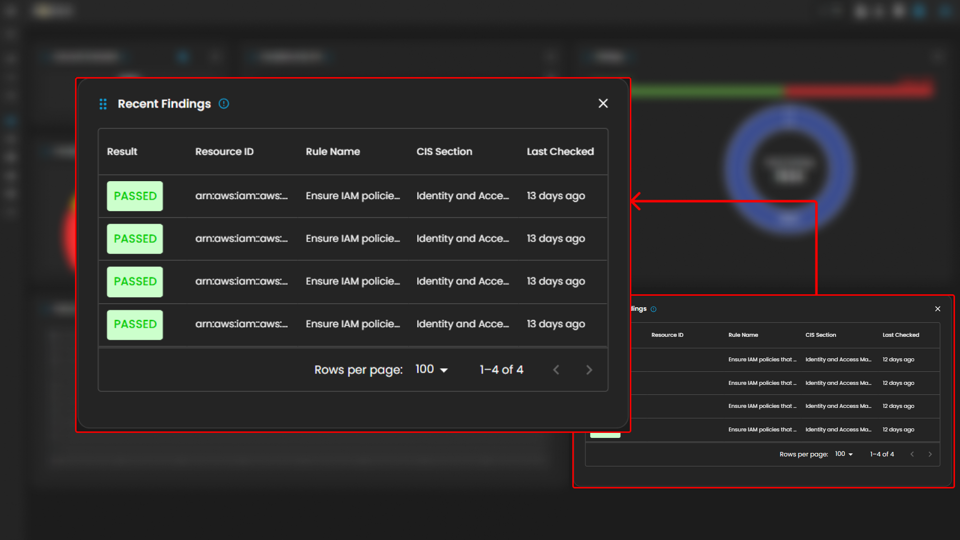 In the Findings Dashboard - it shows you all the detailed misconfigurations evaluated by our CSPM Module. Here you view the Result, Resource ID, Resource Name, Resource Type, Rule Number, Rule Name, CIS Section, Last Checked and Cloud.