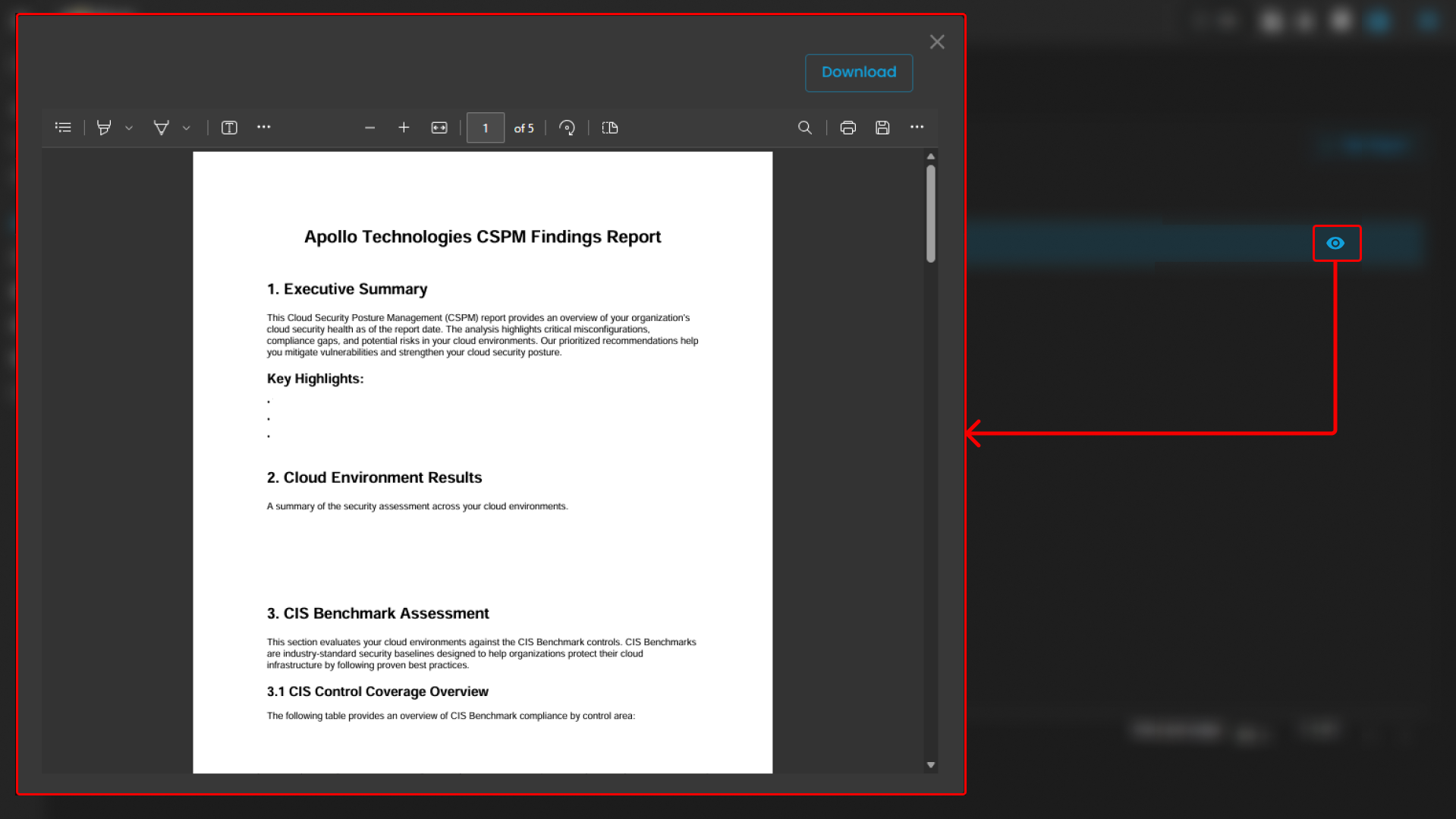 After setting up the report, the user can access it by pressing the "👁️" emoji. Users can also download it by pressing the download button at the top right of the pop-up window.