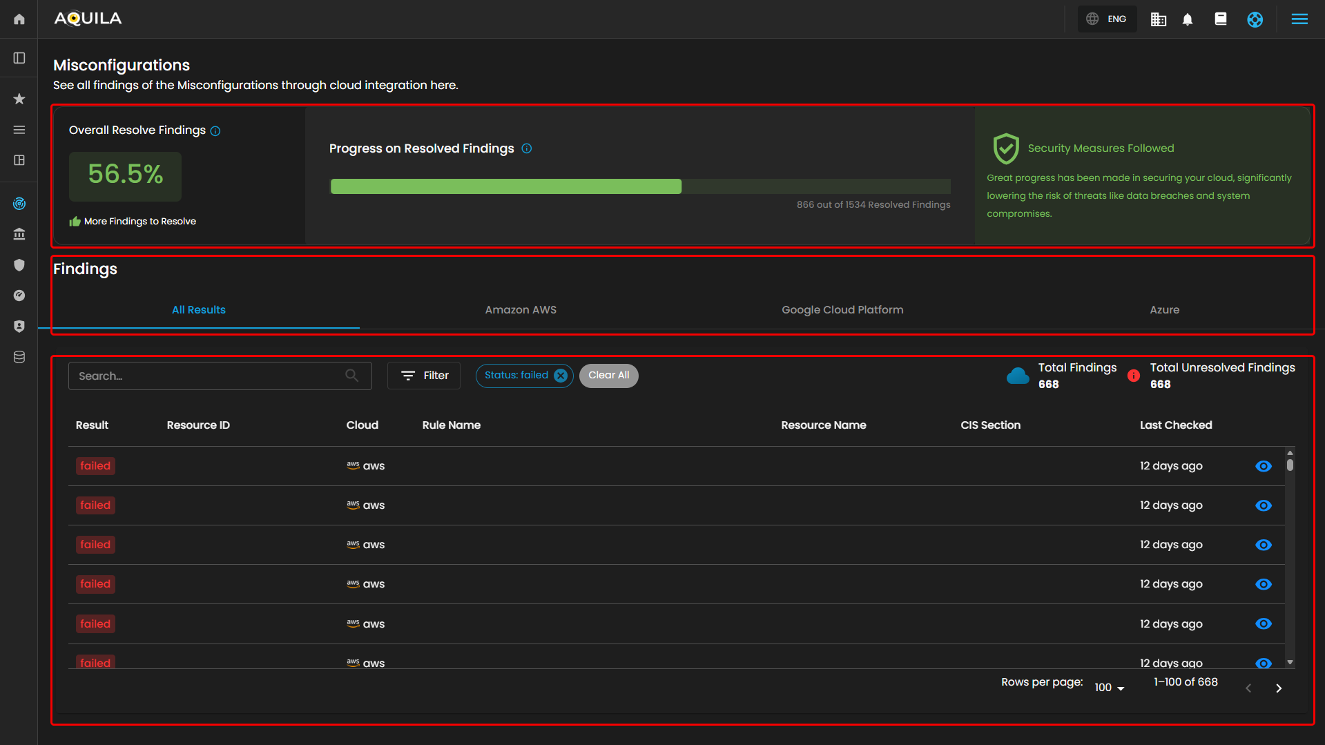 - Lists all misconfiguration findings from all cloud providers in one consolidated view.