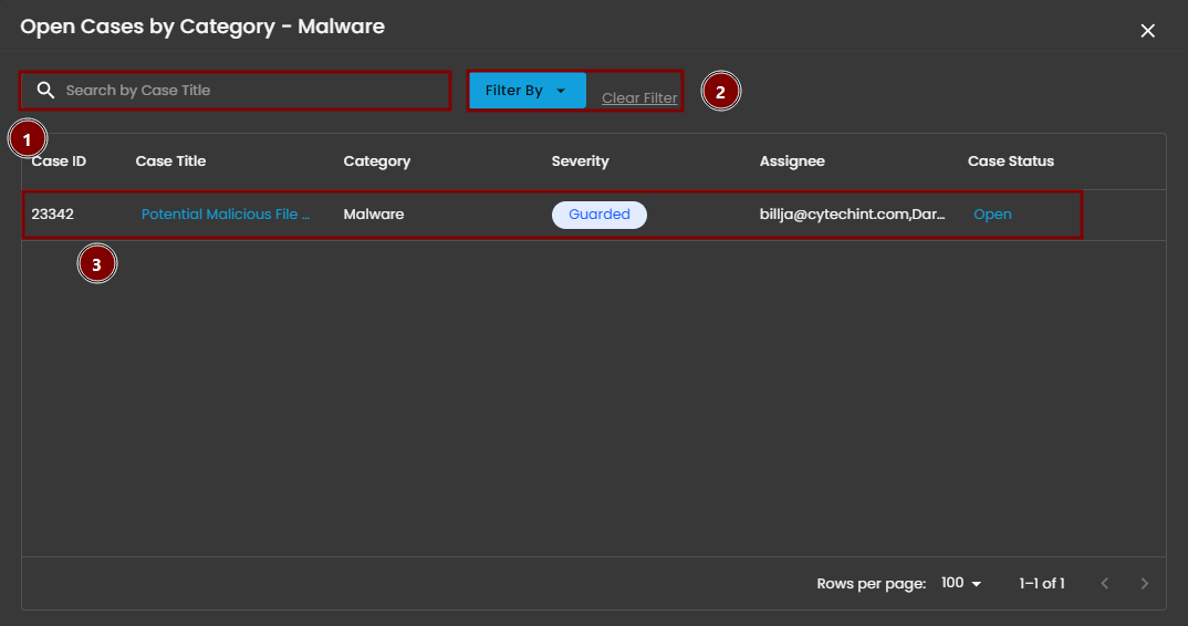 Shows the number of cyber incident cases specifically assigned to you for investigation and resolution. Clicking on it will open up a small window that will show all the cases assigned under you.