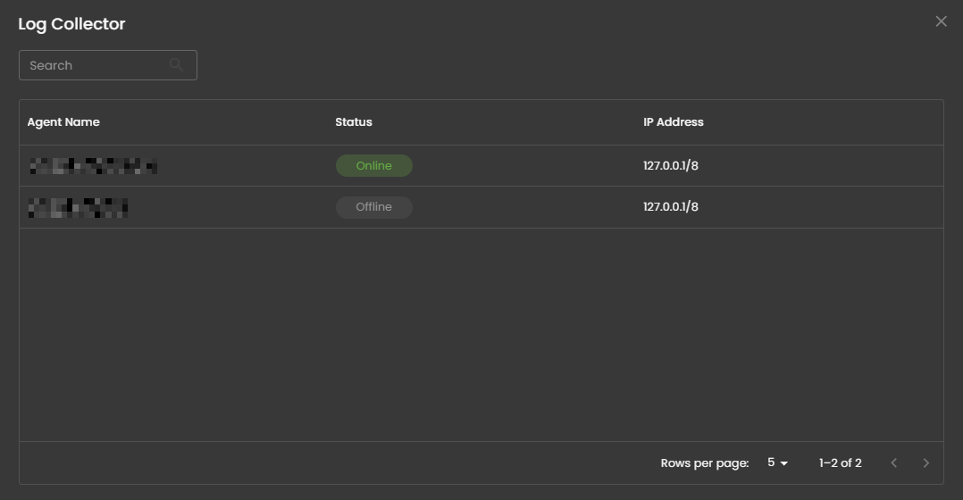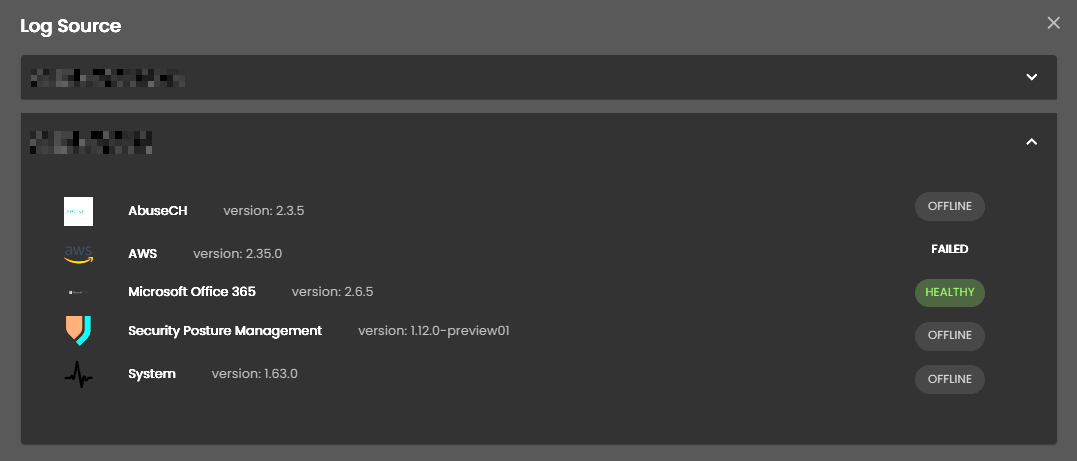 When selected, a dialog window is displayed showing all installed log collectors. You can switch between collectors to view the integrated log sources associated with each one, along with their respective versions and current status, including whether log ingestion is functioning properly.
