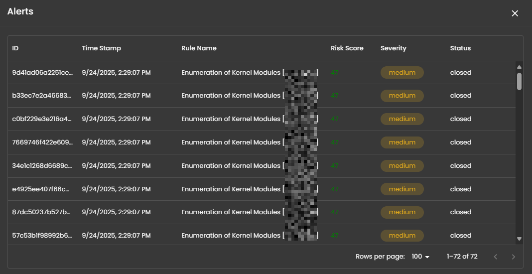 This view displays a summary of alerts grouped by their corresponding detection rules. At the top of the panel, the total number of alerts is presented. Below this, each rule is listed alongside the count of alerts it has generated. Users can scroll through the list to view additional rules when the number of entries exceeds the visible space. This view enables quick identification of which detection rules are generating the highest volume of alerts, supporting prioritization and investigation activities.