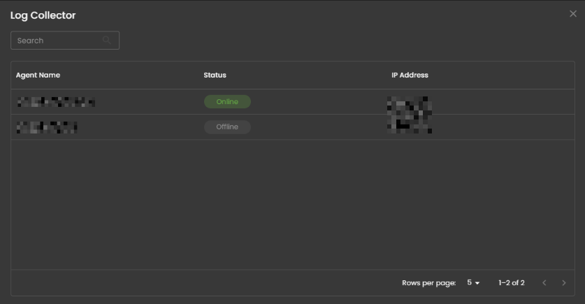 When selected, a dialog window is displayed showing all installed log collectors. You can switch between collectors to view the integrated log sources associated with each one, along with their respective versions and current status, including whether log ingestion is functioning properly.