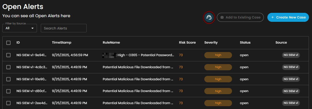 Search Alerts: This text-based search field enables users to query alerts by keywords, rule names, IDs, or other relevant attributes. Entering a search term dynamically filters the alert list, allowing users to quickly identify and focus on alerts of interest.